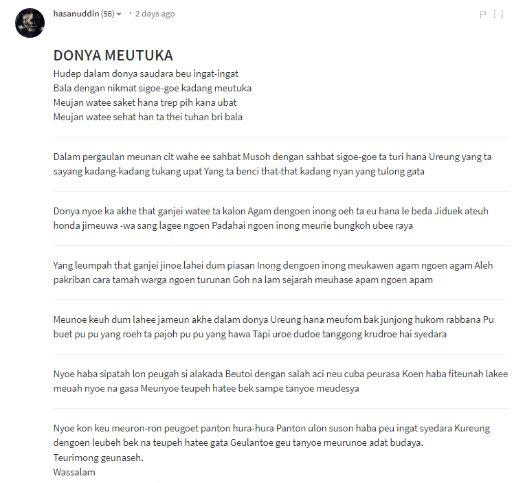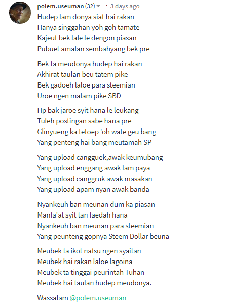 Terimong geunaseh ukeu @sogata nyanka nepeugot kontes #panton aceh, karna kaneu ikot lestarikan adat reusam ngon budaya aceh melalui steemit. Semoga geutanyoe seumaken cinta deungon panton aceh seubagoe warisan endatu geutanyoe.saleum