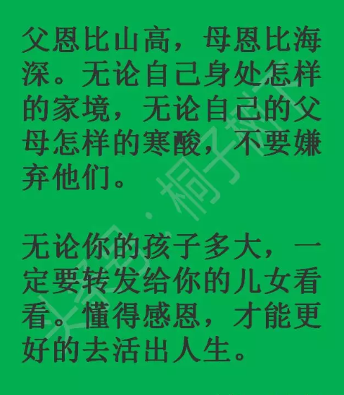 父母恩情永难报!再忙,再苦,再累,一定要打开看看,写的很到位wangdong168 (25)in #parents • 8 years ago 父母恩情永难报!再忙,再苦,再累,一定要打开看看,写的很到位 父母之恩永远难报答。桐子树下美文 好好珍惜一辈子。美文 做父母的不容易,一生一世,多理解。桐子树下 无论你的孩子多大,都要告诉他们这些道理。美文 人生一世,不容易。走在成功的道路上,且行且珍惜。桐子树下 爹娘不容易,把你抚养成人。美文 #grace