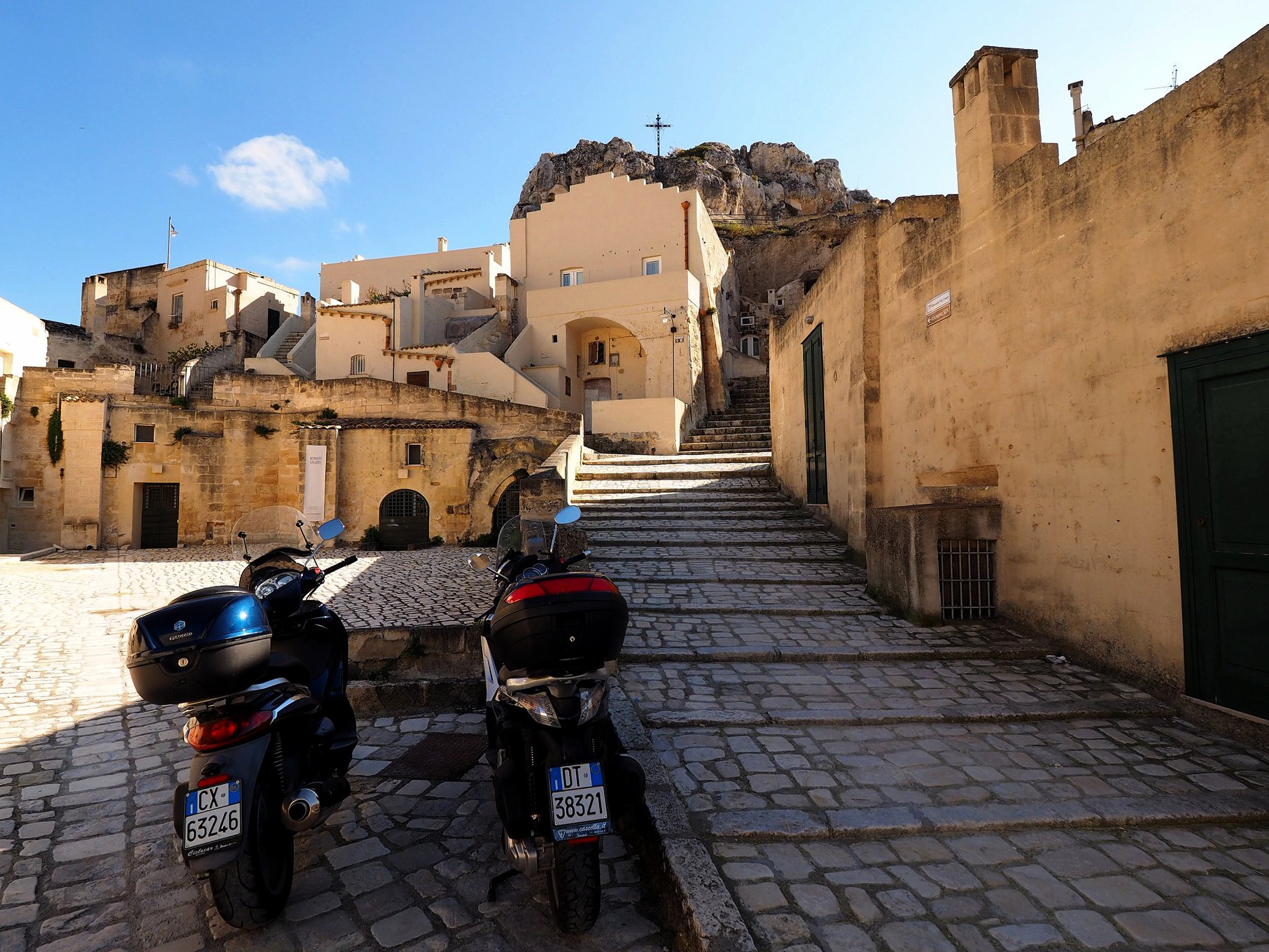마돈나 데 이드리스 교회(Chiesa della Madonna de Idris)로 올라 가는 계단길과 두 대의 모터사이클.
