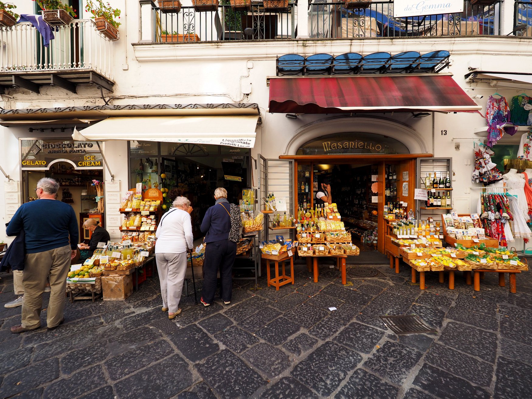 아말피: 파스타, 레몬, 와인 등을 파는 상점, 골목을 걷다 보면 코 끝을 스치는 레몬향에 취해 상쾌한 기분이 든다