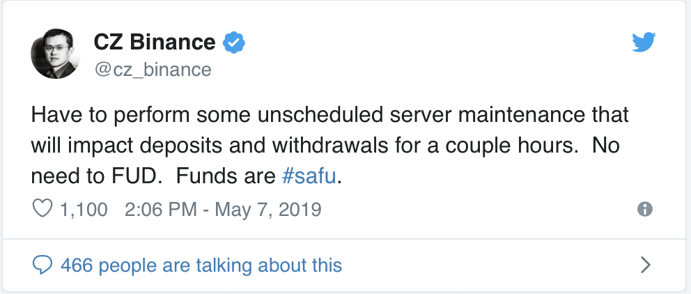 As has become usual in exchange hacks, the breach in was announced via an “unscheduled server maintenance” tweet. That alarmed a number of Twitter users, who messaged CEO Changpeng Zhao, wondering if the exchange had been hacked.