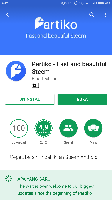 Partiko.io ini tergolong aplikasi anyar di mana versi 1.0.6 baru dirilis secara publik sekitar dua hari yang lalu. Aplikasi ini kini sudah tersedia di Google Play, dan saat posting ini saya tulis baru mempunyai 100 download.