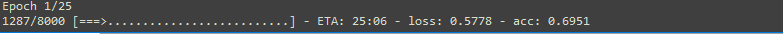 What this shows is it will process all 8000 training images 25 times, with each round being referred to as an epoch. With each epoch taking about a half hour, it should be just about done. I'll check it out in the morning and tell you how I did.