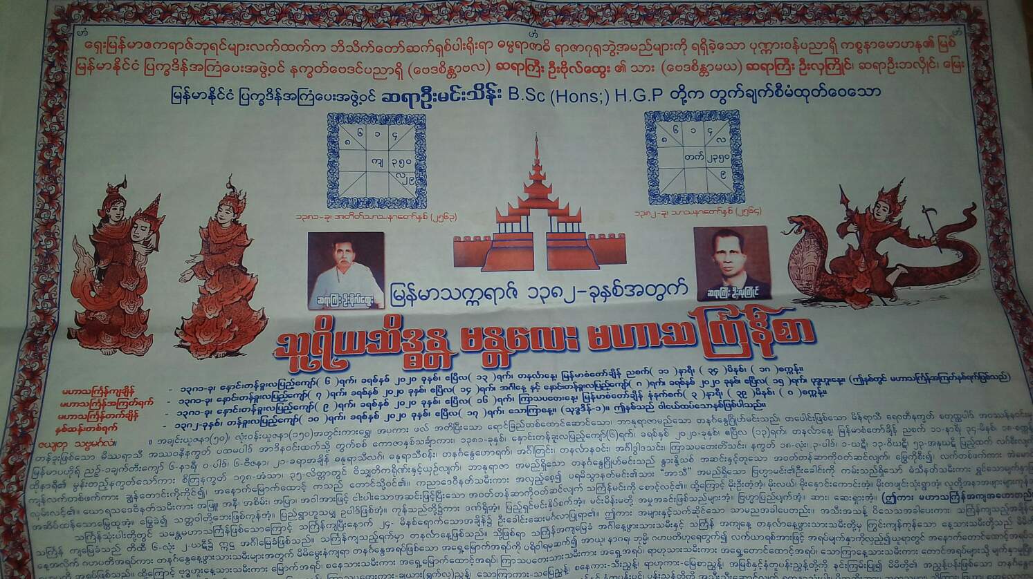 ဇယျတု သဗ္ဗမင်္ဂလံ။ ။ အချင်းယူဇနာ(၅၀)၊ လုံး၀န်းယူဇနာ (၁၅၀)အတွင်းကားရွှေ၊အပကား ဖလ် အတိပြီးသော ရောင်ခြည်တစ်ထောင်ဆောင်သော ၊ဘာနုရာဇာမည်သော တနင်္ဂနွေဂြိုလ်မင်းသည်၊ တပေါင်းဖြစ်သော မိရာသီ ရေ၀တီနက္ခတ် စုတ္ထပါဒ် အ၀ဿန်န၀င်းမှ တန်ခူးဖြစ်သော မိဿရာသီ အဿ၀နီနက္ခတ် ပထမပါဒ် အာဒိန၀င်းထက်သို့ တွက်စစ် ကောဇာနှစ်သင်္ချာကား၊ ၁၃၈၁ ခု ၊နှောင်းတန်းခူလပြည့်ကျော်(၆)ရက် ၊၂၀၂၀ခုနှစ်၊ဧပြီလ(၁၃)ရက် တနင်္လာနေ့ မြန်မာစံတော်ချိန် ညစက်(၁၁)နာရီ၊(၃၄) မိနစ်၊(၁၈) စက္ကန့်။ မြန်မာပဟိုလ်ညဉ့် -၁ ချက်တီးကျော် ၆-နာရီ၊ ၀-ပါဒ်၊၆-ဗီဇနာ၊၂၁-ခရာအချိန် ဓနုရာသီစန်း၊ တနင်္ဂနွေဟောရက် ၊အင်္ဂါတြင်း၊တနင်္လာန၀င်း၊အင်္ဂါဒွါဒသင်း၊ကြာသပတေးတိံသင်း၊နက္ခတ်-၁၈လုံး၊၃-ပါဒ်၊၁-ဃဋီ၊၁၃-၀ိဃဋီ၊၅၃-အနုဃဋီ ပြည့်ထက်လဂ်စီးလျက်၊ ထိုနာရီ၏ မွန်းတည့်နက္ခတ်သော်ကား စိတြနက္ခတ် ၁၇၈-အံသာ၊၃၅-လိတ္တာတွင် ဗိသျှတိကရိုဏ်းနှင့်ယှဉ်လျက်၊ ဘာနုရာဇာမည်သော တနင်္ဂနွေဂြိုလ်မင်းသည် နွားနို့သစ် အဆင်းနှင့်တူသော အ၀တ်တန်ဆာကို၀တ်ဆင်လျက် ၊မြွေကိုစီး၍၊လက်တစ်ဖက်ကား အဲမောင်း၊ကျန်လက်တစ်ဖက်ကား ချွန်းတောင်းကိုကိုင်၍ ၊ အနောက်မြောက်ထောင့်ကသည် တောင်သို့၀င်၏ ။ကညာဒေ၀ီနတ်သမီးကား အလှည့်စေ့၍ ပရမိသွာနတ်မင်း၏သား & အာသီ &အမည်ရှိသော ဗြဟ္မာမင်း၏ဉီးခေါင်းကို ကမ်းသည်ရှိသော်ဓံသီနတ်သမီးကား ရွှင်သောမျက်နှာဖြင့်၊ လှမ်းလင့်၏ ၊ဃောရသဒေ၀ီနတ်သမီးကား အဖြူ အနီ အစိမ်း အပြာ အ၀ါအားဖြင့် ငါးပါးသောအဆင်းဖြင့် ပြီးသော အ၀တ်တန်ဆာကို၀တ်ဆင်လျက် သင်္ကြန်မင်းကို စောင့်လင့်၏ ။