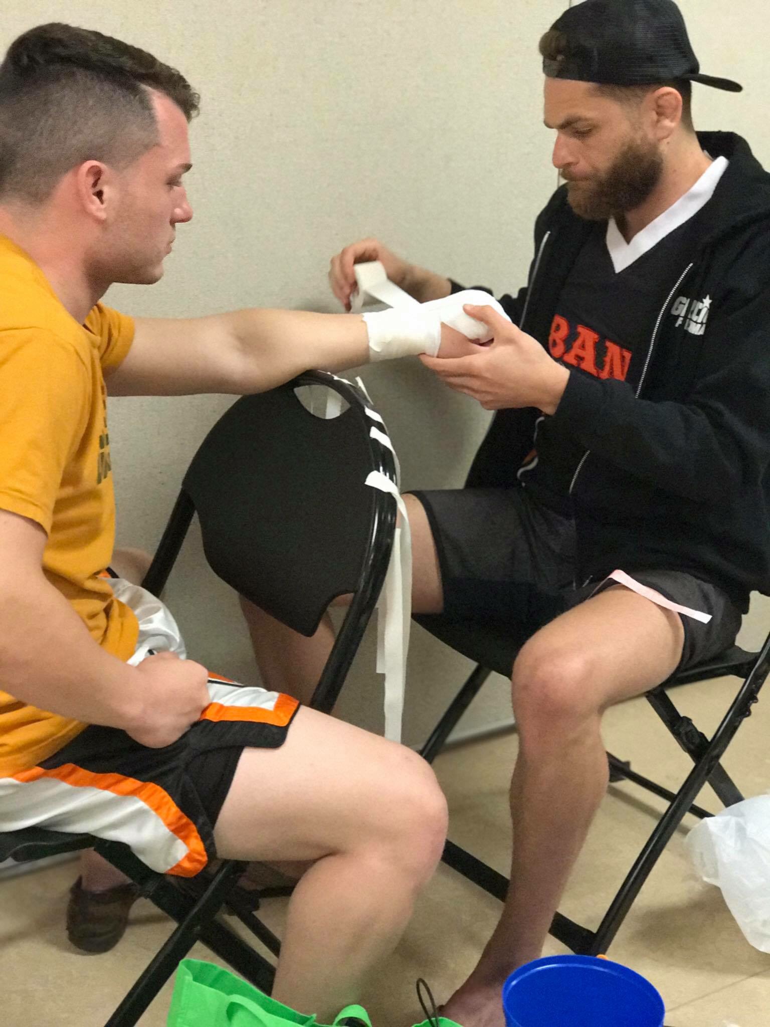 This exact moment right here is when all your doubts and fears start racing through your head. You question what you are doing here? Am I really about to step into the cage with another man? Did I train enough? The nervous feeling in your stomach keeps growing but the fears you have are dwindling and the confidence starts to grow as your hands are wrapped. Months of hard work, blood, sweat, and tears are put into training for one fight and you only have 9 minutes/one night to show your hard work. Once your hands are wrapped it’s show time and you can’t look back, only one thing on your mind and that’s kill or be killed! I live for these moments.