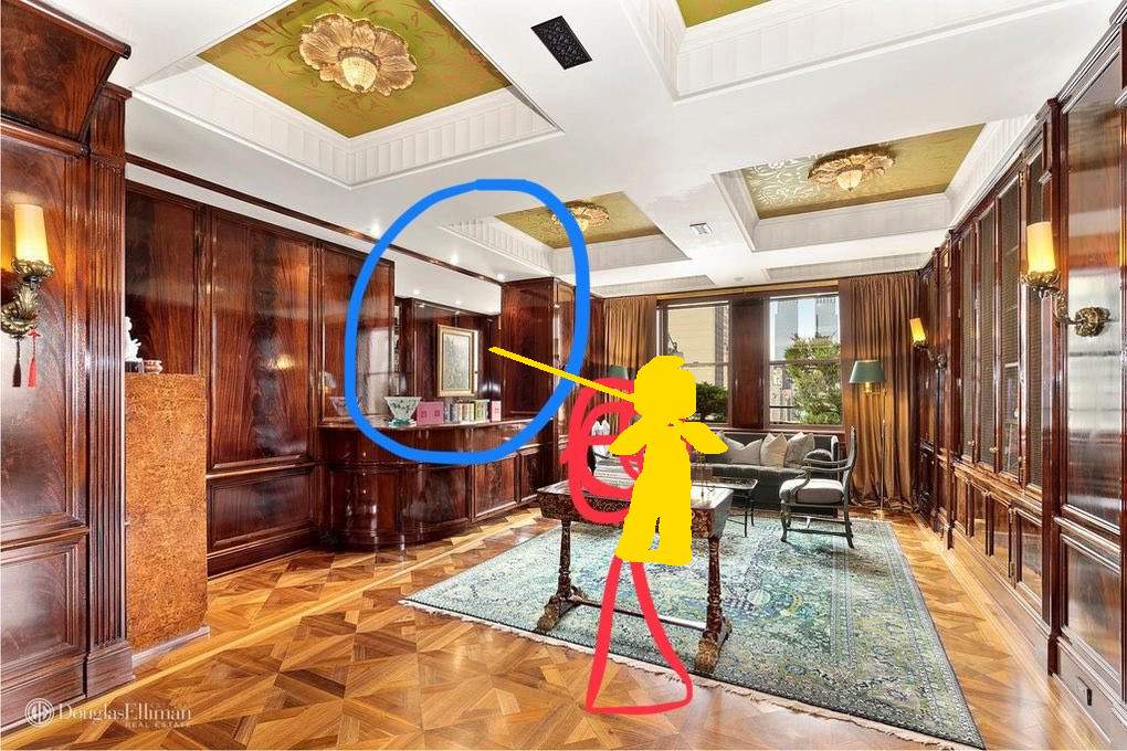 再连线,视角被平面图黑色区域,即照片的家具立柜所遮挡,不可能看到吧台窗户。