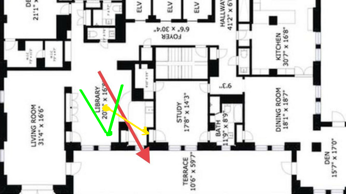 对比整个18楼的建筑平面图,从斜后方过道和后面家具反射的阳台光线这两个关键项来看,所处房间应该就是这个LIBRARY。