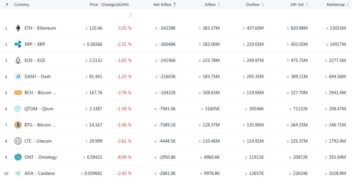 ETH has the most capital net outflow today, which is -54239K USD. Its price has dropped by 3.25%.