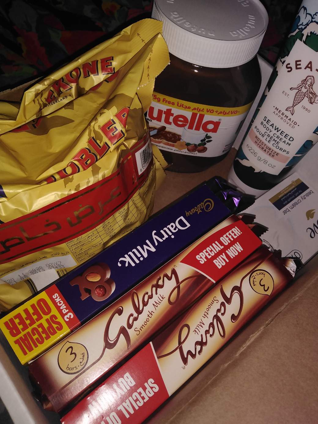 Got a package from my sister all the way from UAE. Sweets, Body scrub and dove soap. 😁😍