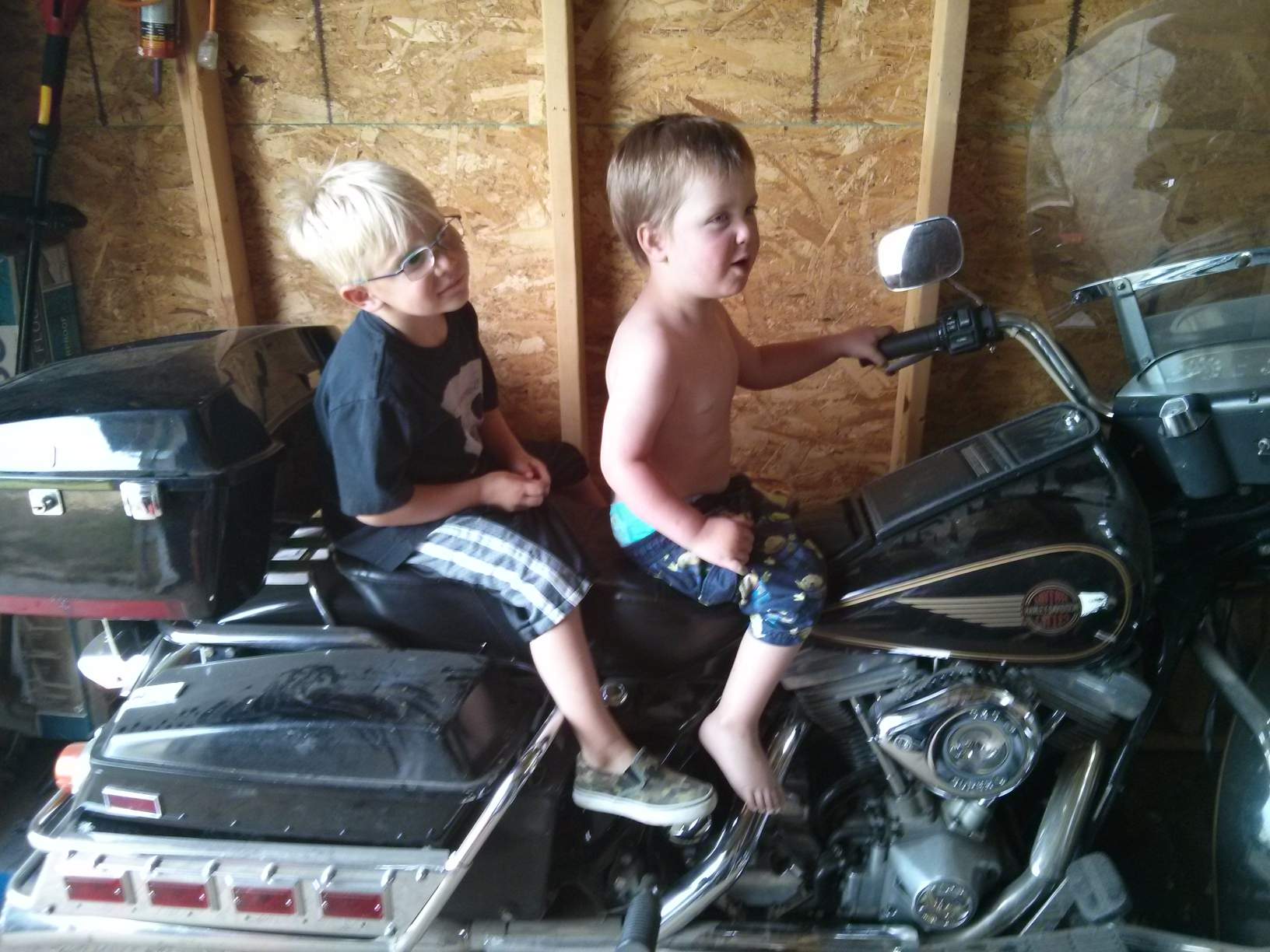 This is my Grandson and great Nephew on my old hawg because of two reason the 1984 piece of junk keeps break down on me and there mothers won't let me take them for a ride. Maybe they heard I fell of my father's Old '36 Indian mc while riding in the field, when I was three. I still don't remember him saying you gotta hold to the handle bars tight when your sitting on the tank. It's alright I landed on my head.