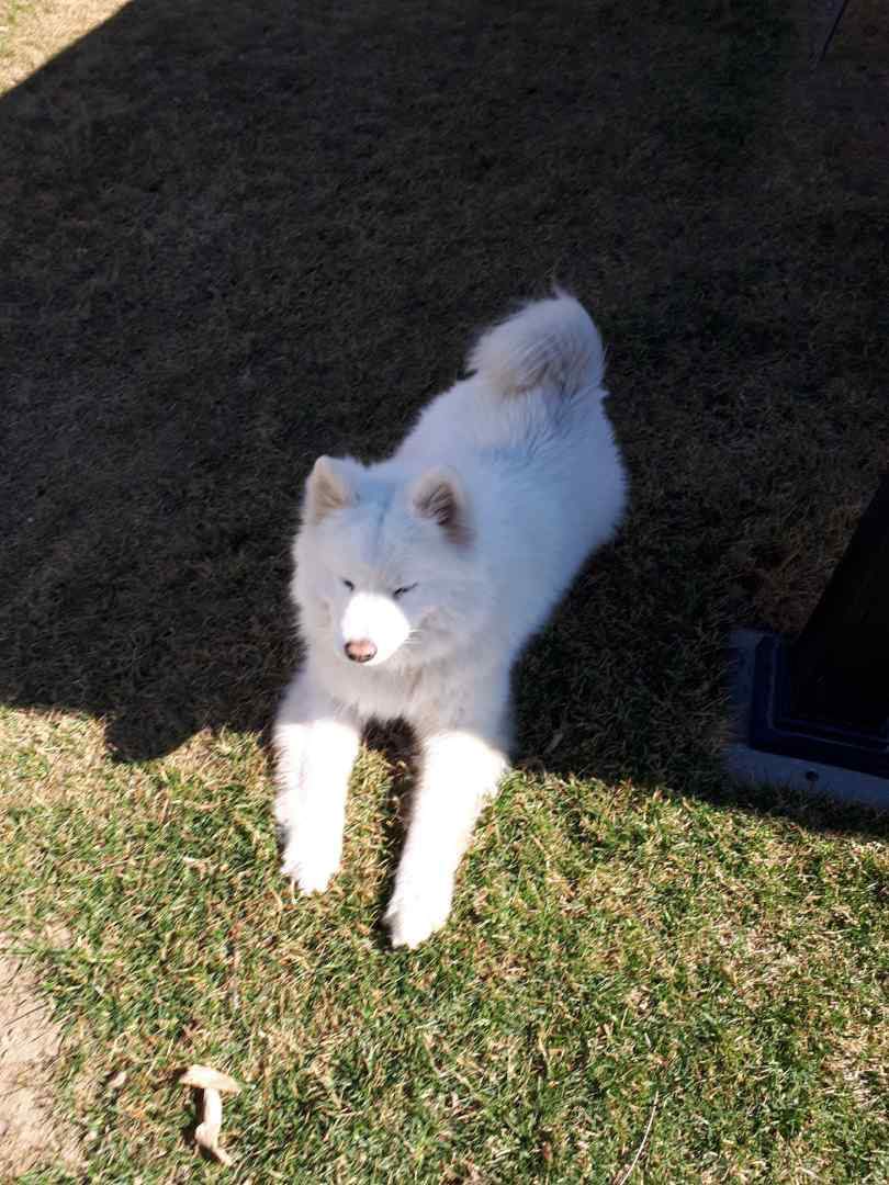 While doing some amatuer repair work welding on our tractor in the carport. I made a small tack weld, turned around to meet a beautiful snow white Husky dog. Not knowing her name or gender at the time it was friendly, happy and responsive to my talking. I was glad I was positioned between her in the welding project because it is no good to watch any welding with bare eyes and she had a problem with her left eye when we introduced ourselves. I sat down and gave her some attention and wiped her Eye with a wet wipe (baby bottom wipe, ssshush don't tell anyone a tuff guy used them). I looked for a name on her pink flowered collar no luck, maybe she had an ID tatoo in her ear, again no luck. I asked her what her name was and again no luck. Hmmm poor beautiful pooch appeared to be lost. Then I saw a glass contractor 2 doors down measuring my neighbors windows so problem solved, it must be his dog, hah again no luck so I improvised a leash from 1.5 meter ( 5ft.) piece of rope for a leash and took her for a walk for the better part of it she listened, she heeled well and acted with wonderful manors but 200 meters (650 ft.) up the street to the west nobody had claimed her, a car started heading towards us and the dogs ears went up and the car stopped, the dog jumped up and leaning on it, but wait that's my neighbor from 100 meters eastward of my house. Jill my neighbor said the dog came to visit her about 4 hours earlier and it was much the same scenario. Except she had put it in the back yard so she could make some phone calls and go online to neighborhood watch the dog dug under her fence and adopted me. Well after that conversation I though I should feed the pooch something so a little to my cats demay, I used a hand full of whiskas and a half can of the neighbors borrowed dog food. When I was setting it down the dog was patient and sat when asked but it sure didn't last long poor thing had not eaten in a while.