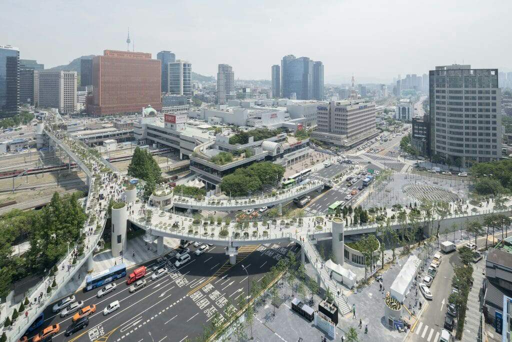 Dhau ntawm xyoo 1970, lub Seoul Chaw Taws Xob Overpass cuam tshuam rau sab hnub tuaj thiab hnub poob ntawm South Kauslim Capital rau ntau tshaj li kaum xyoo. Thaum kaw nyob rau xyoo 2015, vim muaj kev txhawj xeeb txog kev nyab xeeb, txoj kev tshem tawm txoj kev tawm hauv txoj kev lag luam tau qhib rov qab qhib lub hlis no, raws li kev sib txig ntawm qhov chaw taug kev.