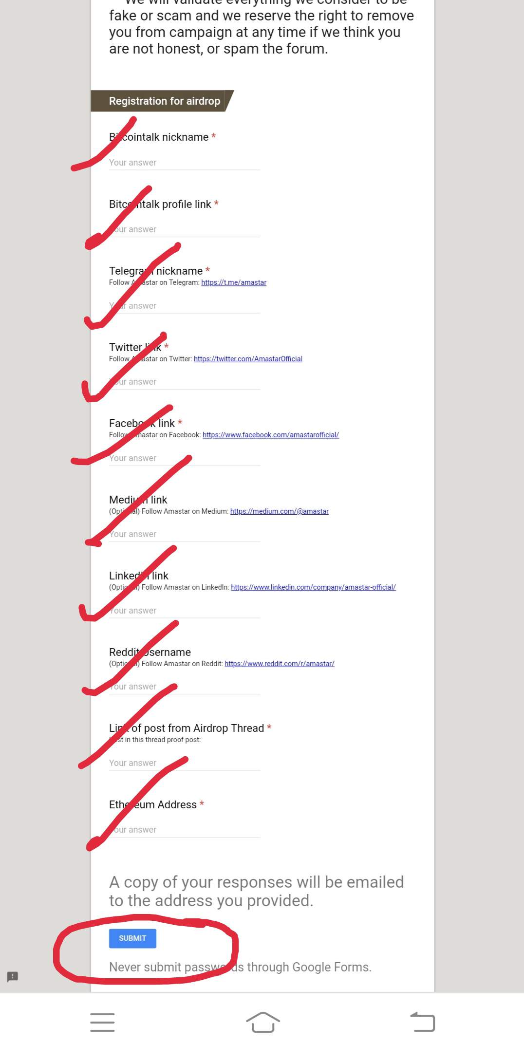 Complete all the social media tasks required for participation in the airdrop followed by Submit the form.