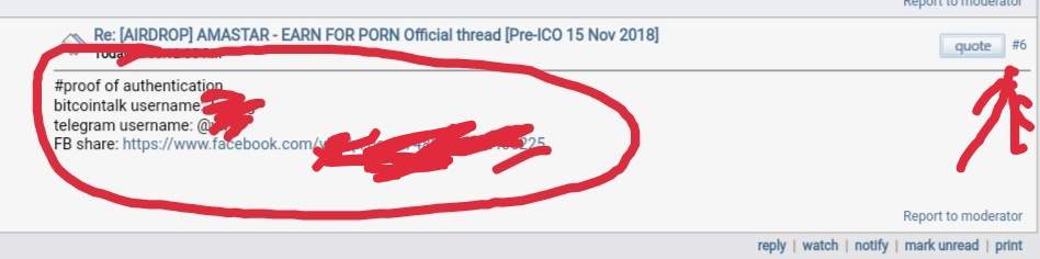 For Link of post from Airdrop Thread type Proof of Authentication in the Bitcointalk Tread followed by Bitcointalk Username, Telegram Username & Facebook Share Link in the reply section
