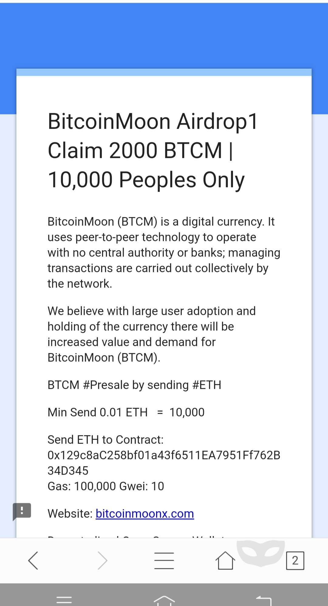 The Project is Airdropping of 2000 BTCM per participant.