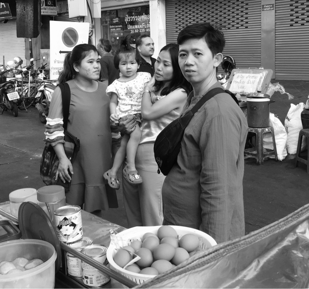รูปนี้เราถ่ายได้ตอนที่เรากำลังเดินไปที่ท่าน้ำสาทรหลายเดือนแล้ว เราเดินผ่านย่านที่เป็นตลาดขายของกินและกับข้าวตอนเย็น การถ่ายภาพตามถนนและผู้คนให้เป็นธรรมชาตินั้นยากมาก เพราะเราต้องหาจังหวะแอบถ่ายภาพไม่ให้คนรู้ตัว และเราไม่สามารถไปจัดฉากได้เลย บางครั้งก็เจอคนหันมามองด้วย สายตาที่ตำหนิว่าเราไม่ควรไปถ่ายรูปเขาแบบนี้ ทำให้ไม่สนุกกับการแอบถ่ายรูปคนตามถนนเท่าไรเลย