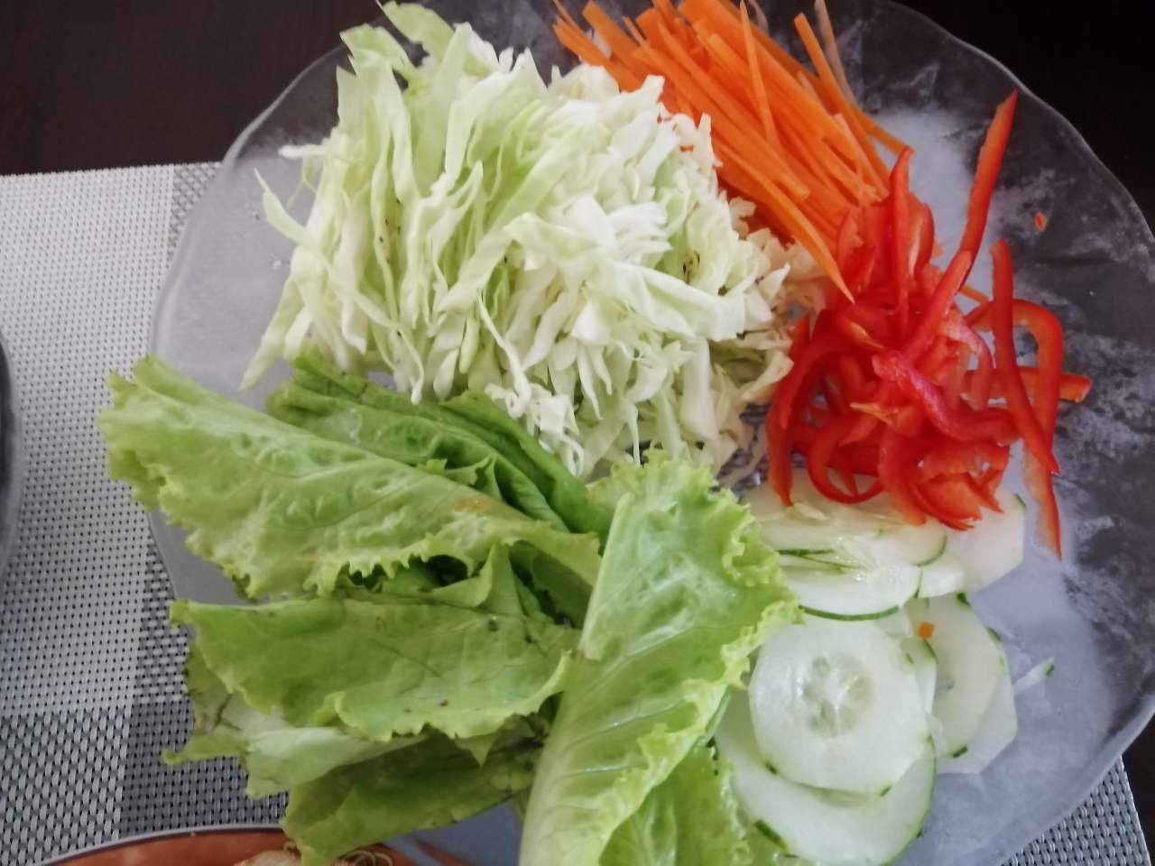 the vegetables are carrots, sweet bell pepper, cabbage, green leaf lettuce and cucumber.
