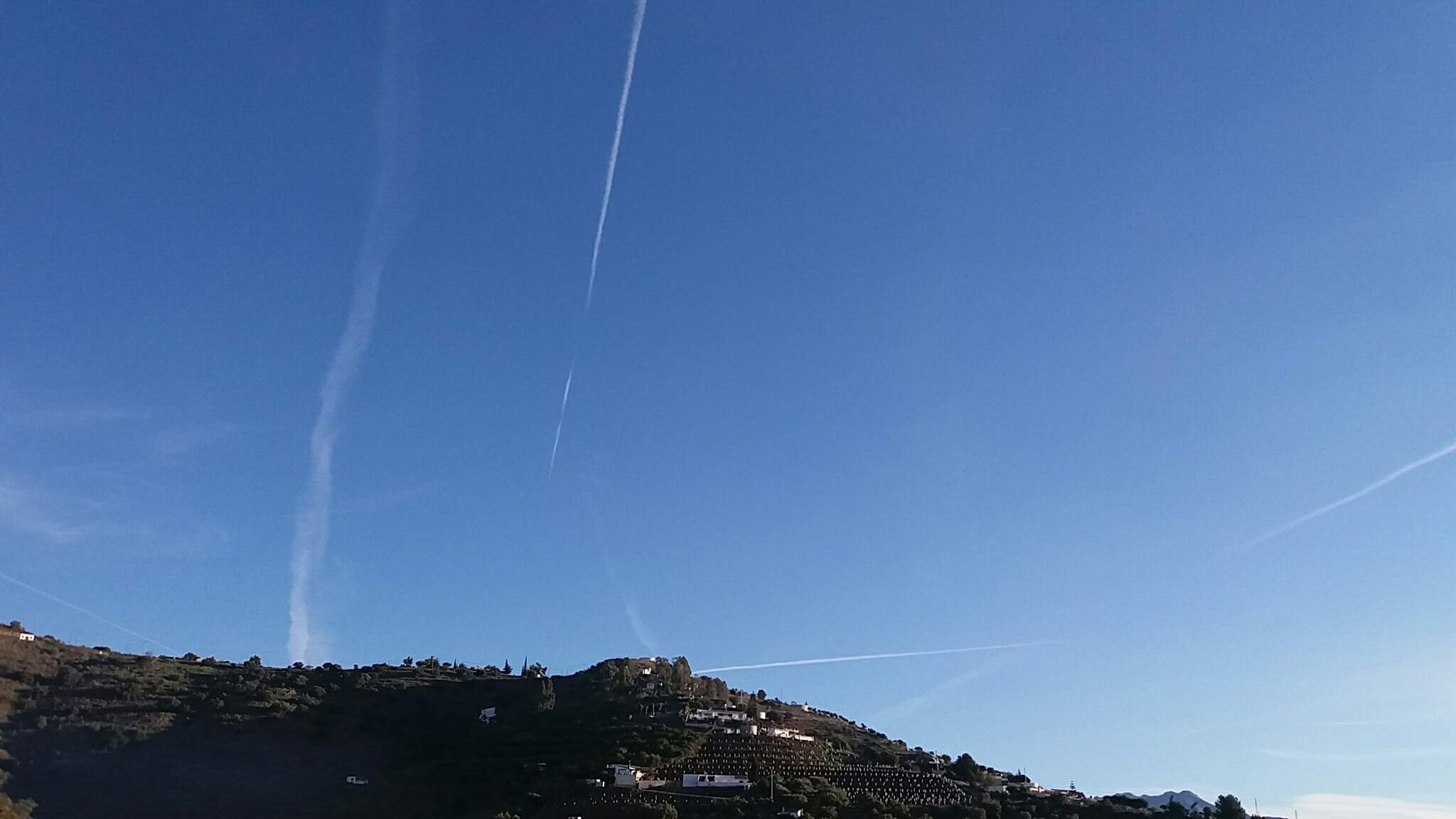 Here in Spain, I should think that the spanish Air Force are doing exercises because this is almost on a daily basis now. Whatever it is they are preparing to, the jet streams are very clear up on the skies here and you can see below the Alpuharras mountains so beautiful and sirene without the jet streams... At the back of these mountains is Granada and the Sierra Nevada .