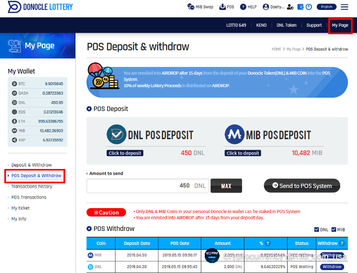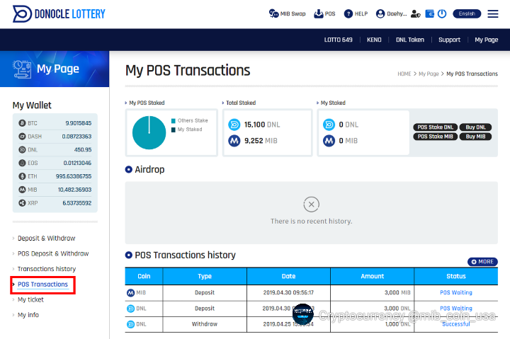 For POS, DDL(Donocle Token) and MIB Coin can be staked. The POS system requires 15 days to pass before the air drop. Daily Lottery Sales are handed out to the user according to their POS stake percentage.