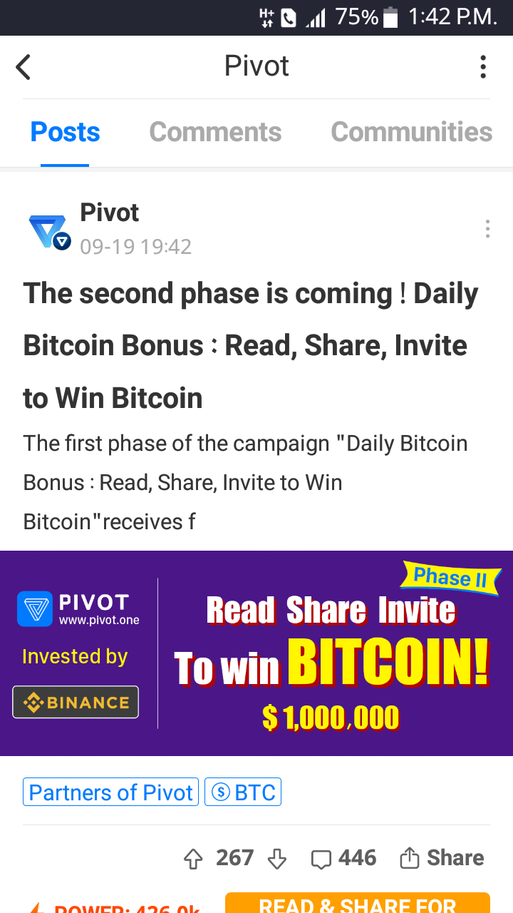 Pivot.one (Daily Bitcoin Bonus : Read, Share, Invite to Win Bitcoin 2nd round)