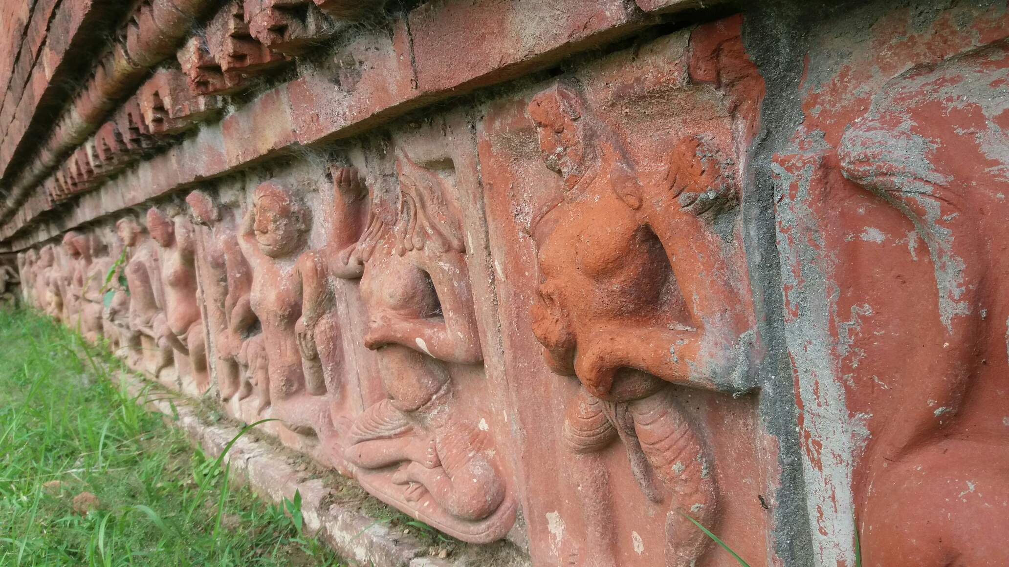 On the outer wall there are Buddha statues, Hindu statues of Hindus and lots of burnt soil plaques.