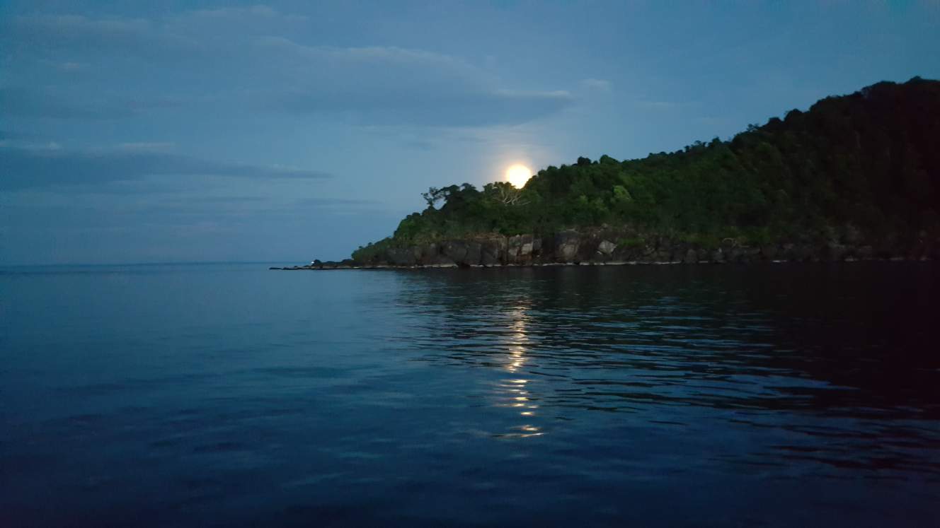On these pictures on a clear day, when I was working for Palm Beach Bungalow Resort and doing a "sunset snorkeling trip" you can see the sunset and the moon rise from behind the Island. What a privilege!