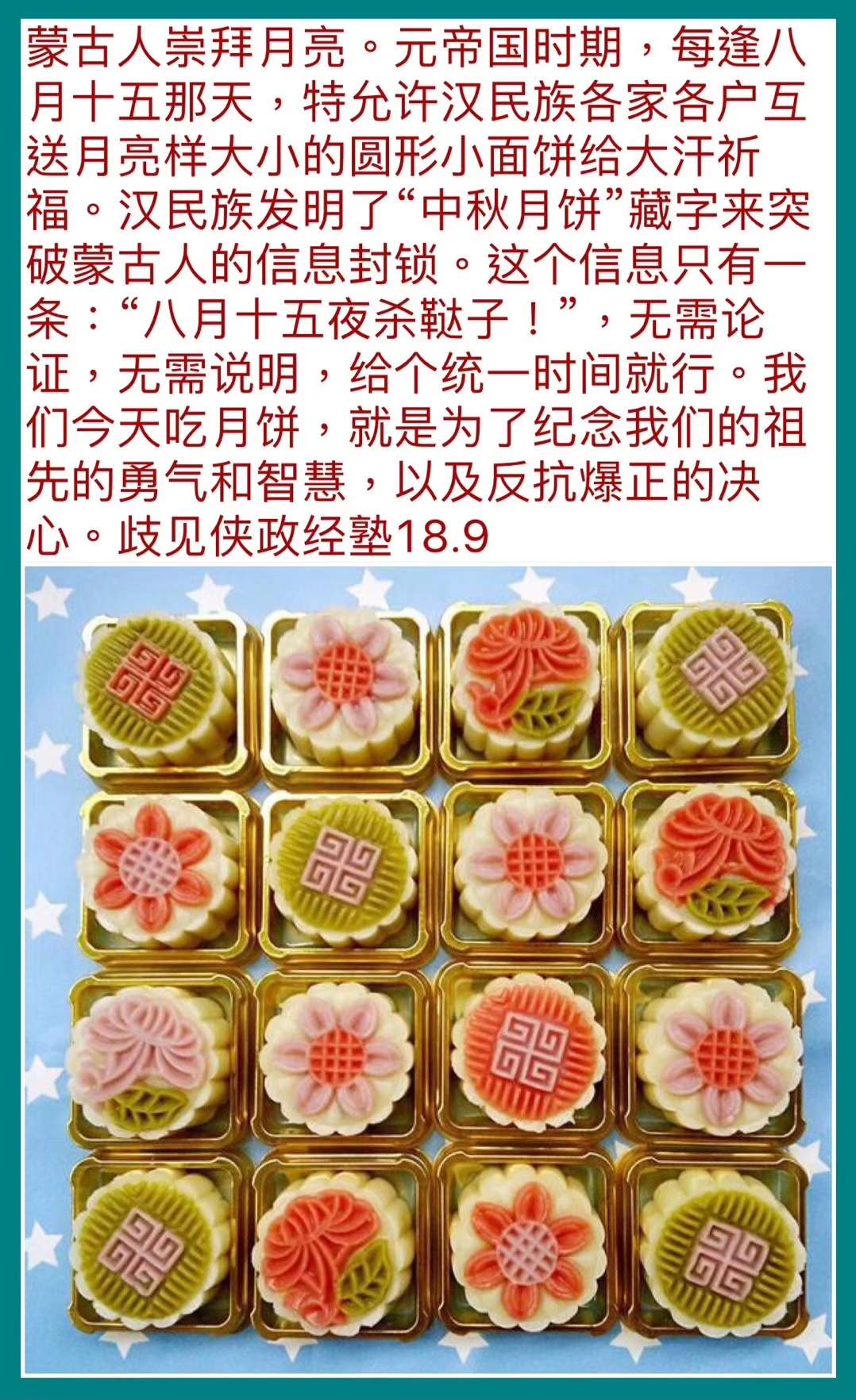 毫无疑问,这个引人发笑的喜当爹段子,就是“八月十五杀鞑子”的故事原型。无恶不作的蒙古和尚与杀喇嘛的情节,正好与反满杀鞑的鸡血挂钩,而朱洪武更是保证流量的热门IP。经过一番魔改,一个原产蒙古、与中秋节气质格格不入的民间传说,便在特殊的历史条件下传播开来。