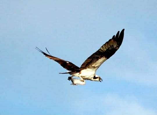 Al día siguiente pasé de nuevo.., el río ya la cubría completo.., y.., comenzó a desplegar sus alas.., al siguiente ya parecía volar bajo el agua sostenida por la lápida.., toda la envergadura magnifica abierta.., impresionate! y al tercer día .., ya estaba un metro bajo agua.., me voy aproximando muy despacio.., cuando veo otra águila soberbi@ sobre el árbol más próximo de la orilla .., dejo de remar y me arrimo con el impulso.., muy lento.., cuando estoy a unos 15 metros del sitio exacto donde está nuestra protagonista..., su compañer@ imponente, regia, sublime..., se lanza en picada centellante.., y..., se sumerge completa en el sitio exacto!!! Con un esfuerzo titánico emerge y carrretea en el agua hasta que levanta el vuelo.., y comienza a dar circulos y a cantar con fuerza desgarradora..., y., cuando está entre el sol y mi posición estupefacta.., se sacude enérgicamente.., y produce un gigantesco arcoiris..,y.., bueee... qué les puedo decir??? Que en este preciso y precioso instante.., lo estoy viviendo con toda mi humanidad...