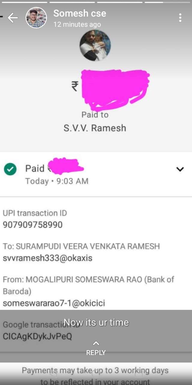 He is mr S.V.V Ramesh from andra pradesh, india his daughter is fighting from life to recover from lever transplant, her mom is ready to help her but their is some amount is required a 12 lacs to hospital work..we are helping him to send some of the amount is giving to him. His google pay and phone pay number is 9000262124 we are given.. Please help him if you want, I am sharing my sending screen short and also giving some other people, they are done now it is your turn