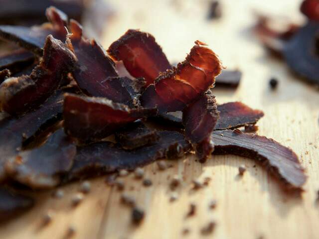 Nws zoo li nqaij nyug nqaij nyug, qhov twg cov nqaij yog topped nrog ntsev thiab spices thiab qhuav, thiab zoo li nyob rau hauv lub tebchaws United States, nws yog ib qho khoom noj txom ncauj zoo rau txoj kev mus ncig ua si. Hom tshuaj noj hnub no rov qab rau cov neeg hauv paus txawm ntawm South Africa.