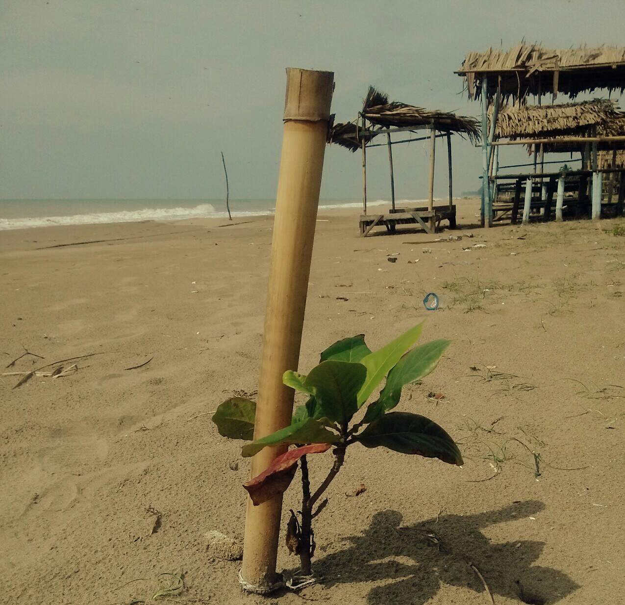 Sebatang benih ditanam di atas pasir di tepi pantai. Penghijauan sangat diperlukan. Tumbuhan bisa memberikan karbon dan juga peneduh dari panasnya mentari. Tumbuhan juga bisa menahan abrasi pantai.