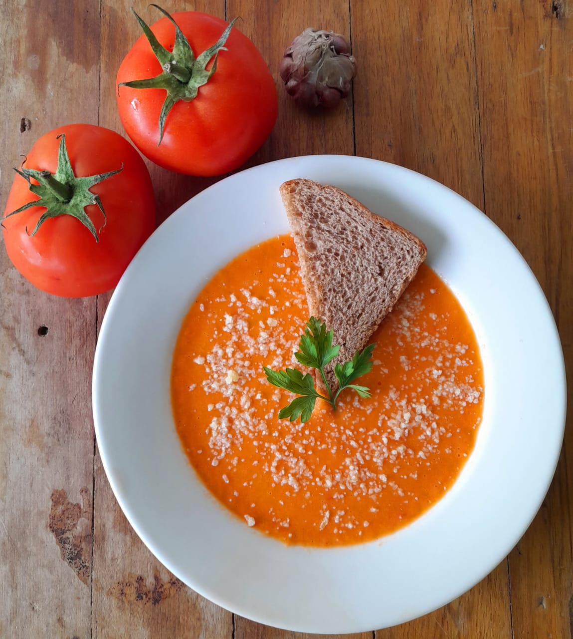Una vez servido, añadimos queso parmesano por encima, colocamos pan integral tostado y unas hojas de perejil. Y ya podemos disfrutar de esta deliciosa Sopa de Tomate y Ajo.