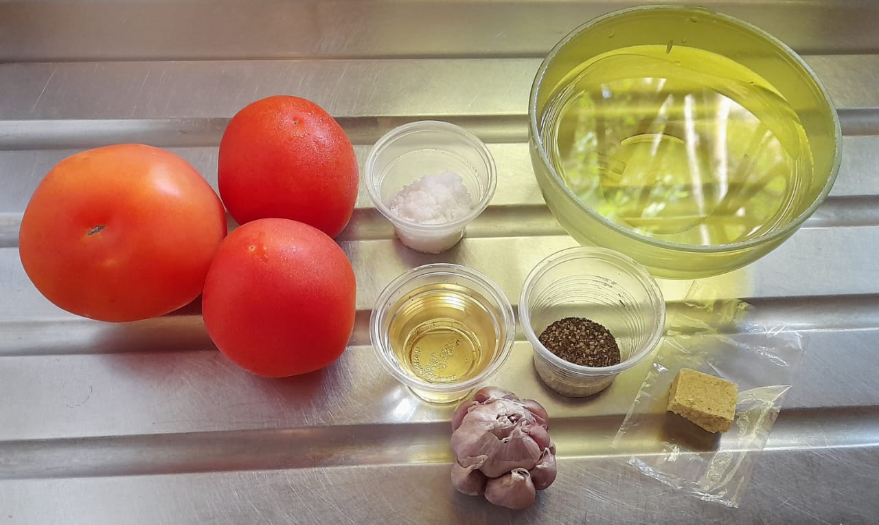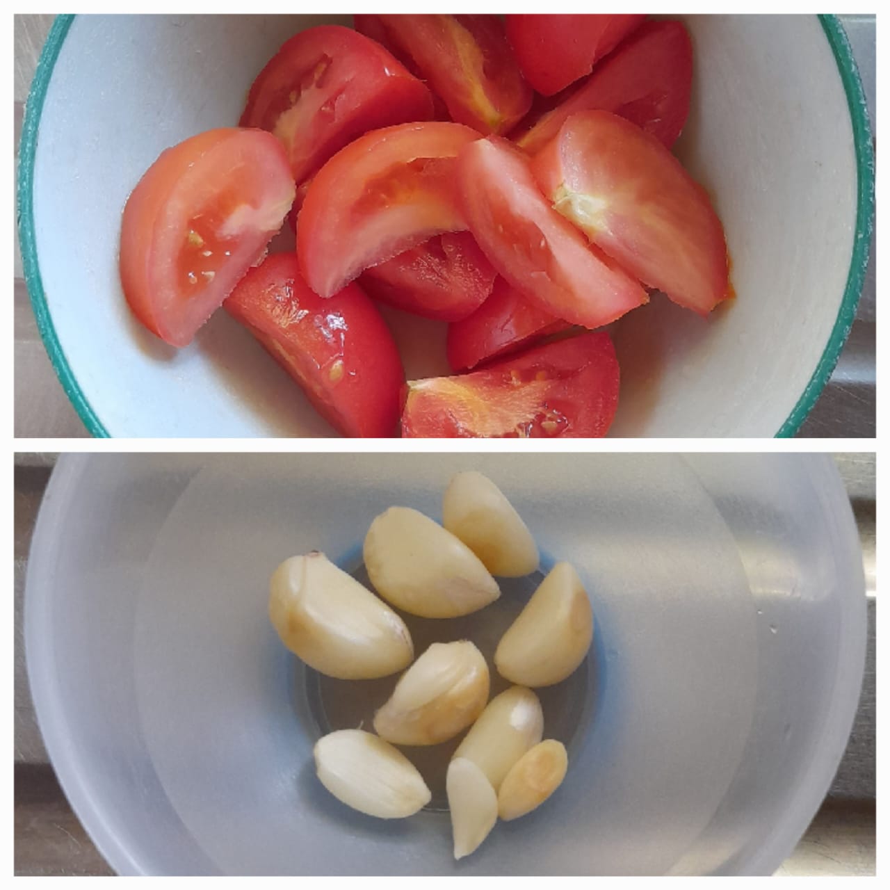 First we are going to wash and cut the tomatoes into quarters. Then we are going to peel the garlic.
