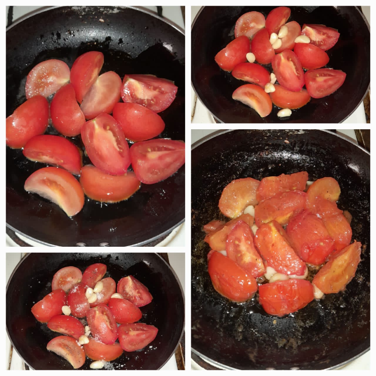 Next we place a frying pan on the fire, once hot we add a splash of oil, then the cut tomatoes, the garlic, salt and pepper. Let cook for several minutes. The tomato should be cooked but firm.