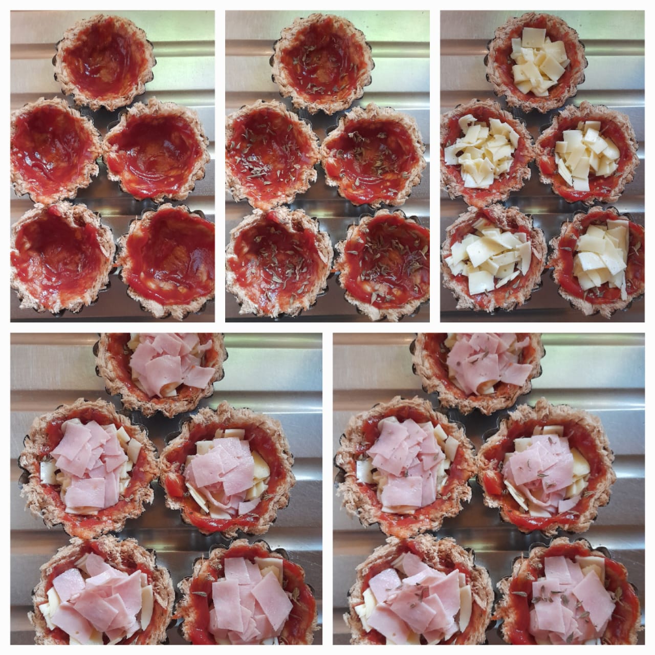Then we are going to add the ingredients; We start by incorporating the tomato sauce, then a little oregano, then we add the mozarella cheese and the ham chopped into small squares, finally we add a little oregano on top.