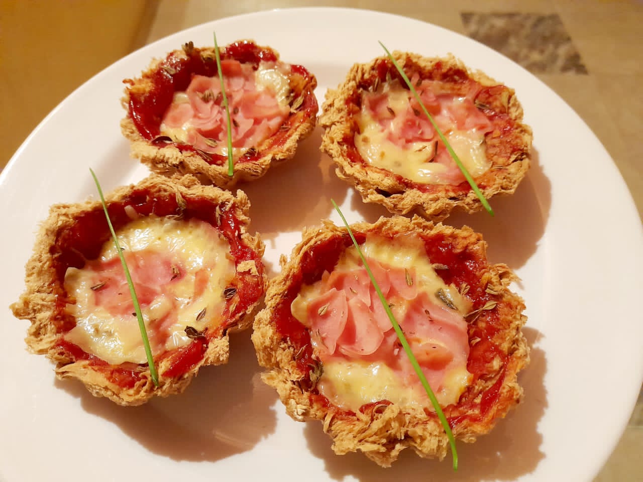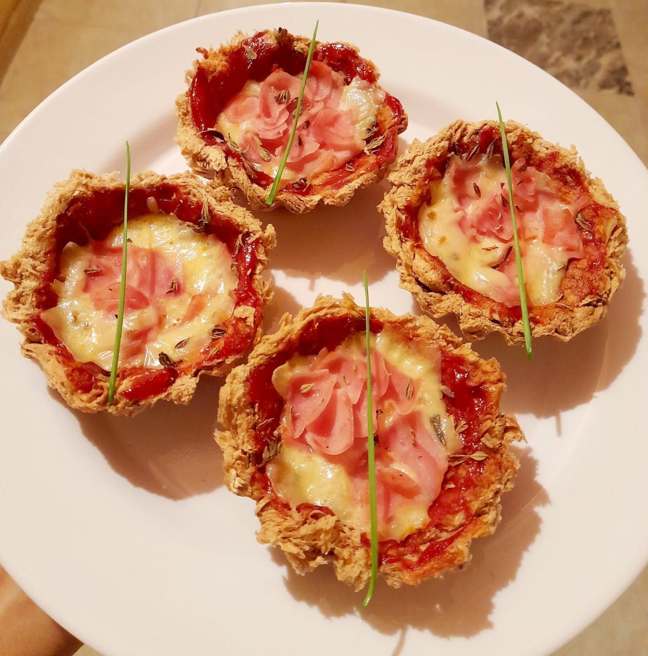 Servimos, colocamos ajo chino por encima y ya podemos disfrutar de estas deliciosas Canastas de Pan con sabor a Pizza.
