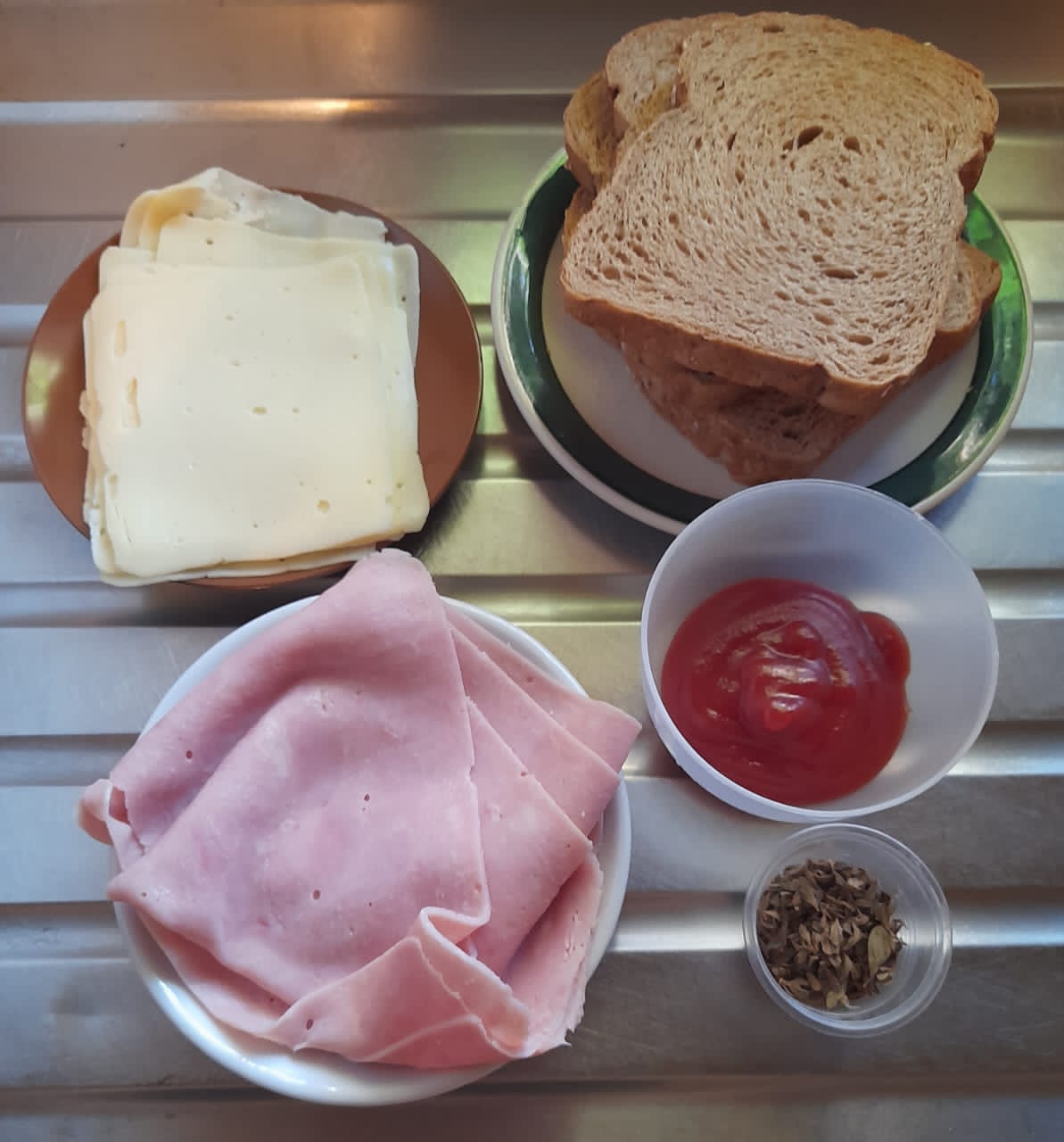 Después vamos a añadir los ingredientes; iniciamos incorporando la salsa de tomate, luego un poco de oregano, seguidamente agregamos el queso mozarella y el jamón picado en cuadros pequeños, por ultimo le añadimos un poco de oregano por encima.
