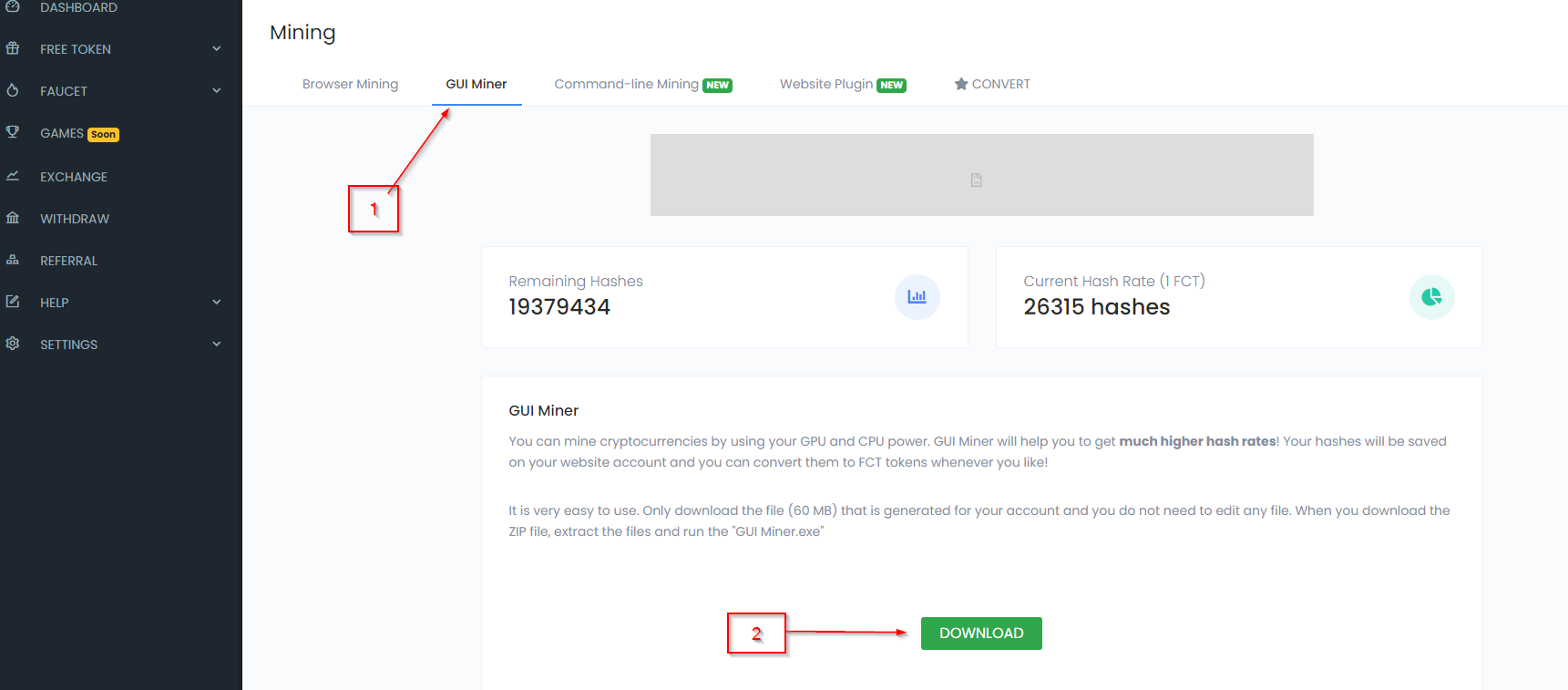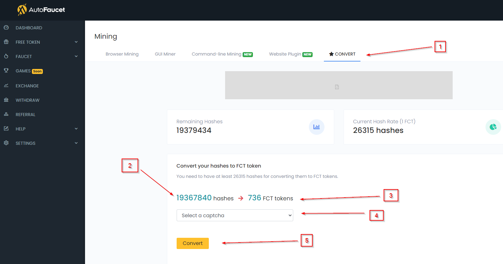 Once you'll let the miner run for i would say over night at least, you'll be ready to convert. Go to the mining section again and click on #1 Convert, #2 shows you how much you have mined for the FCT tokens, #3 shoows you how much FCT tokens you will have, #4 needs to be selected for the convert to be completed