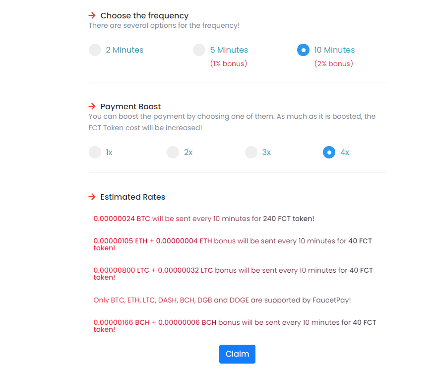 Now scroll down and you'll be able to choose from #1 Credit or FaucetPay which I will be reviewing on my next posting. Then #2 choose the frequency in which you'll be choosing i go with 10 minutes for 2% bonus and then #3 which is the boost and youo guessed it I go with the x4