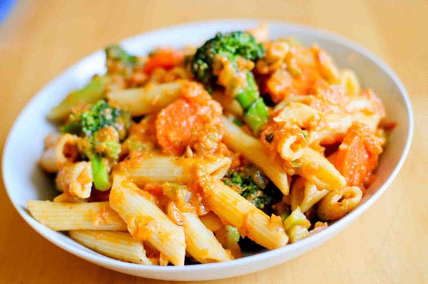 Healthy and Delicious pasta in tomato gravy and steamed Vegetables. Pasta is traditional Italian food but it is famous world wide.