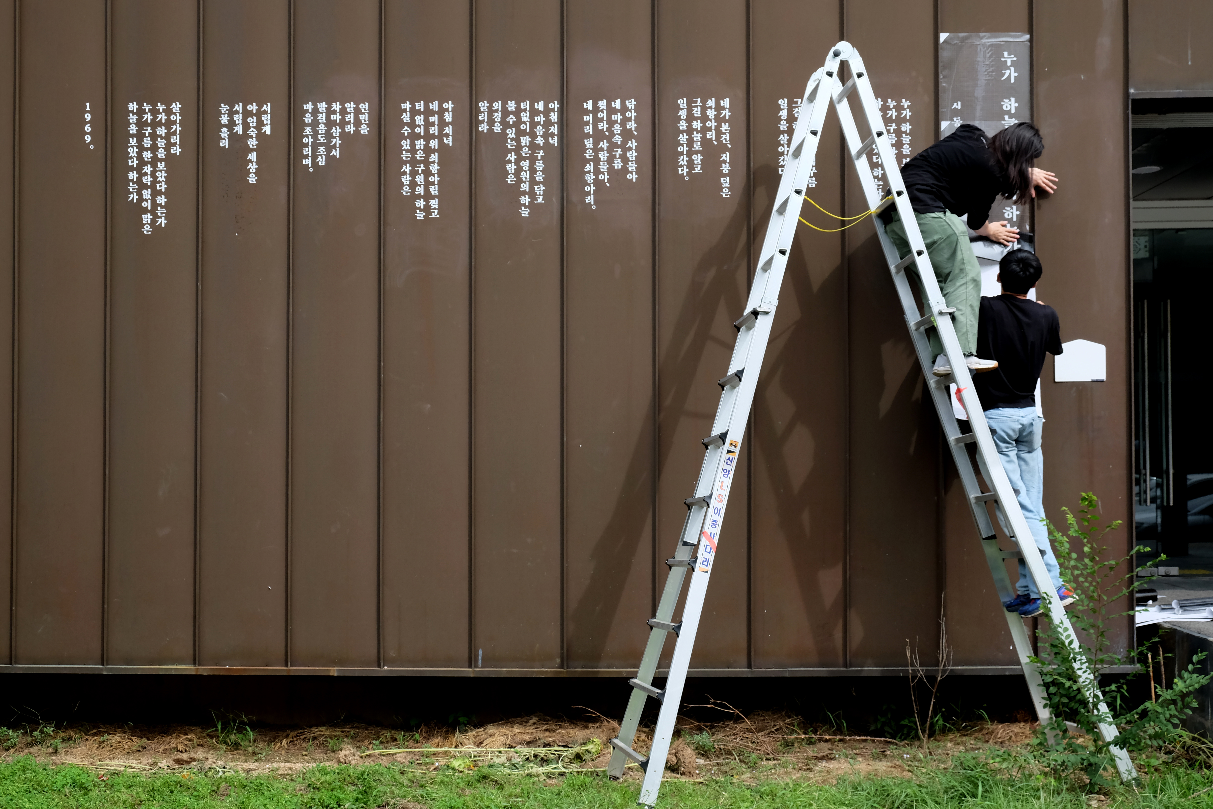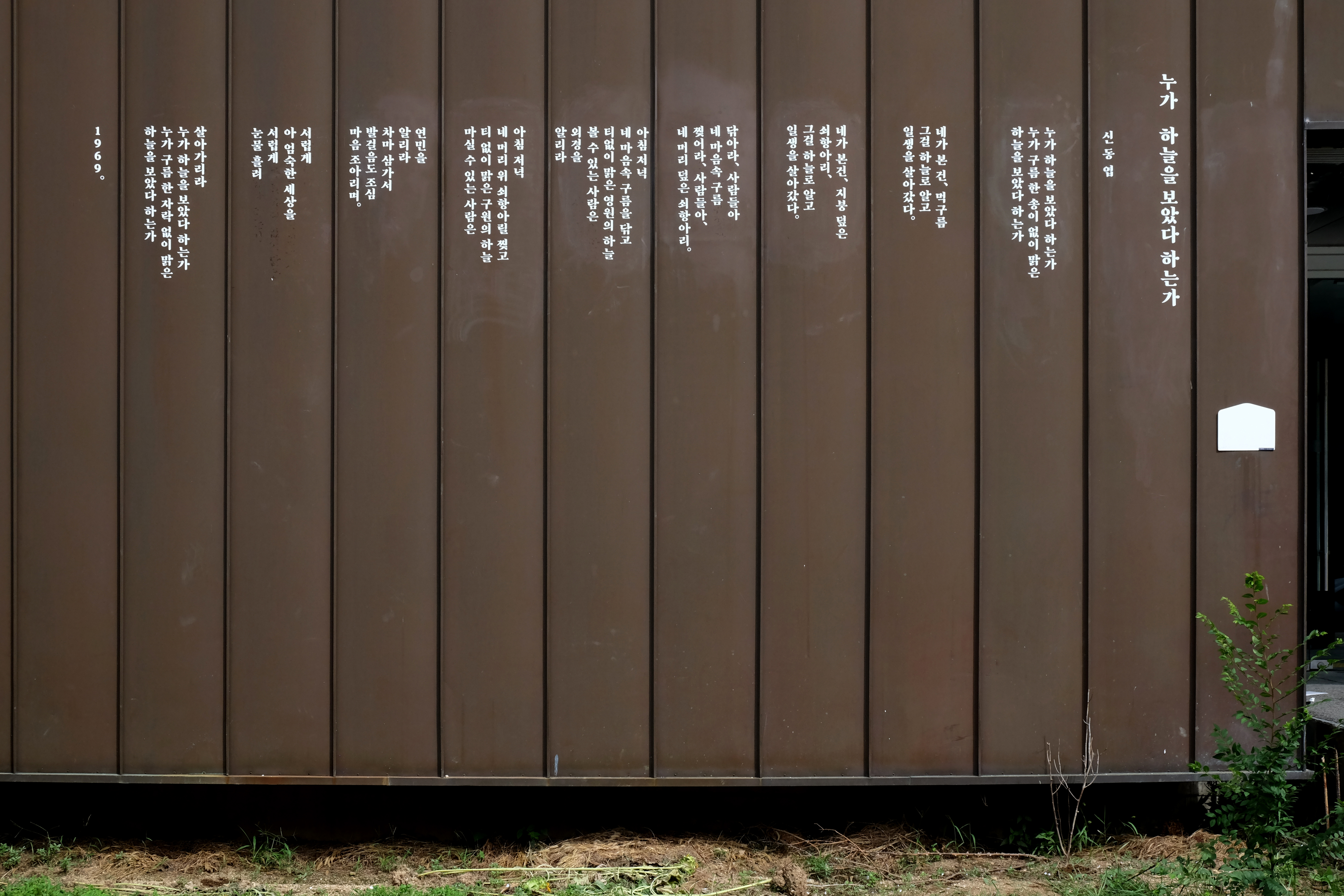시.타 2018 - 전시 ③ 신동엽 <누가 하늘을 보았다 하는가> / 김두섭patipatipati (54)in #pati • 8 years ago <시와 타이포그라피 잔치 2018> 전시 ③ 신동엽 <누가 하늘을 보았다 하는가> / 김두섭 올해 시와 타이포그라피 잔치의 전시로, 12명의 그래픽 디자이너들이 12개의 한국 시와 각각 연결되어 출판도시의 출판사, 작업장 등 곳곳에 시를 표현하였습니다. . 시와 타이포그라피의 파주출판도시 . 시: 신동엽 <누가 하늘을 보았다 하는가> 작업: 김두섭 곳: 문학동네(경기도 파주시 회동길 210) #kr #typography #photography #design