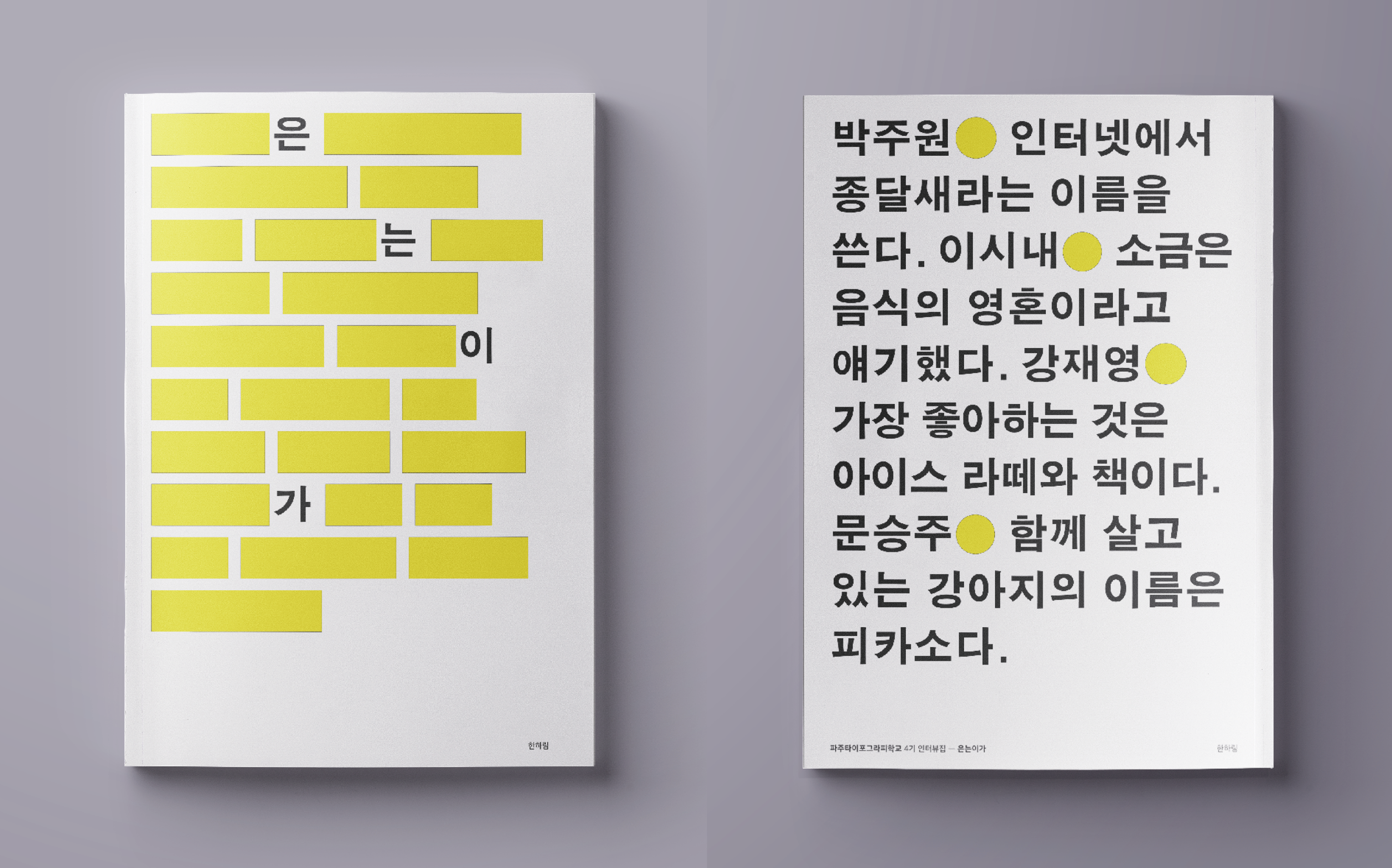 typography / 은는이가rimhahan (46)in #pati • 8 years ago (edited) 파주타이포그라피학교(PaTI) 4기 배우미들의 인터뷰집을 만들었습니다. 늘 작업하던 크기에서 벗어나 타블로이드판 크기로 작업했습니다. 마지막 사진은 순서대로 앞표지와 뒷표지입니다. 판형 254*374(mm) / 쪽수 72p 지도스승: 두루미(오진경) #kr #typography #kr-art #kr-design