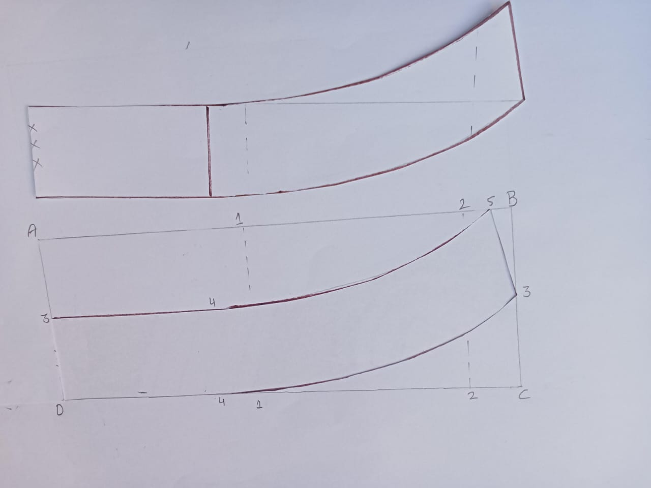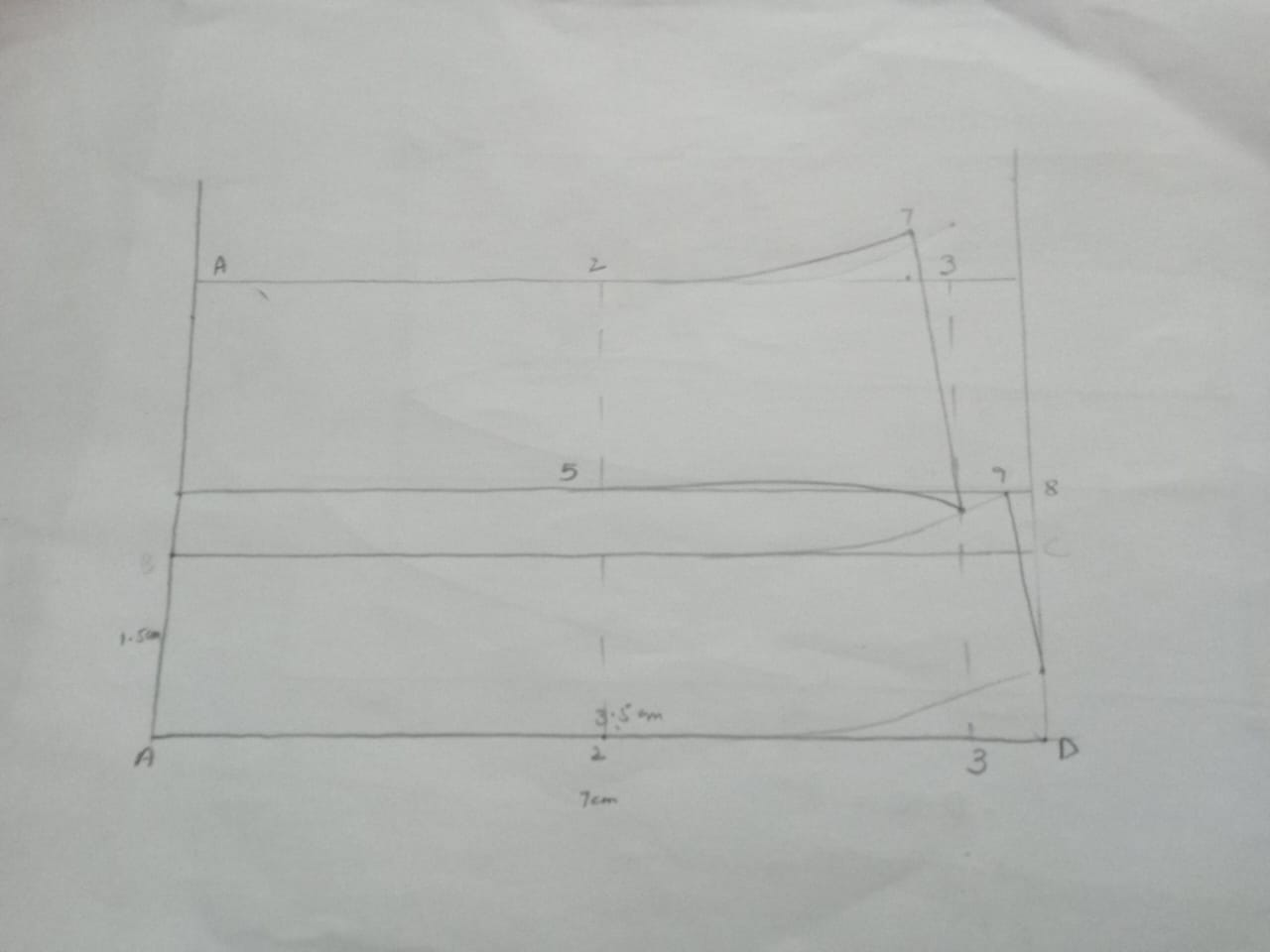 So let's go now the next is towards the collar for this also first of all I have taken its length in 7 cm and I have divided it into two parts we have to do it we have to make the ban and also make the coler. So, first of all, I have put a bread line in the center of the three point, five over centimeters, and its half-bean is 3.5 c.meter, and the collar is two centimeters. Besides, I did it To give the shape, from point two to point seven I have given the shape of his collar and from point five I have given the shape of his collar towards point nine which I have touched above the dotted line of three point.