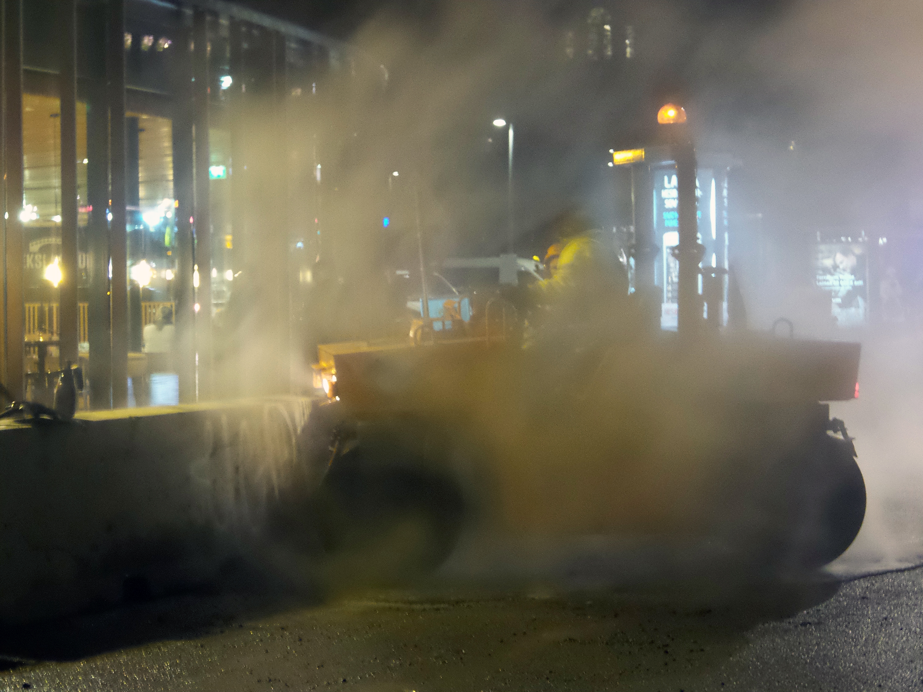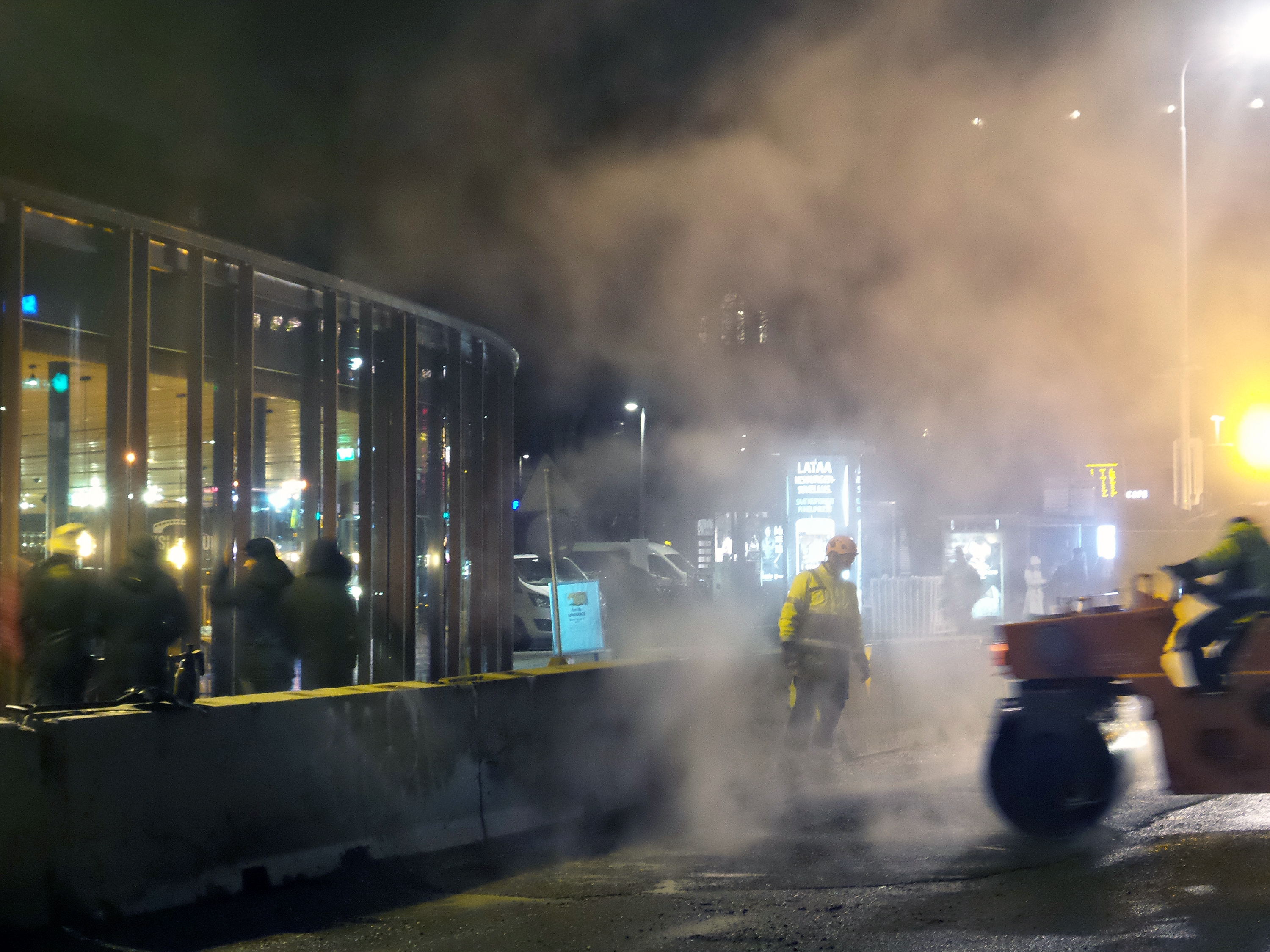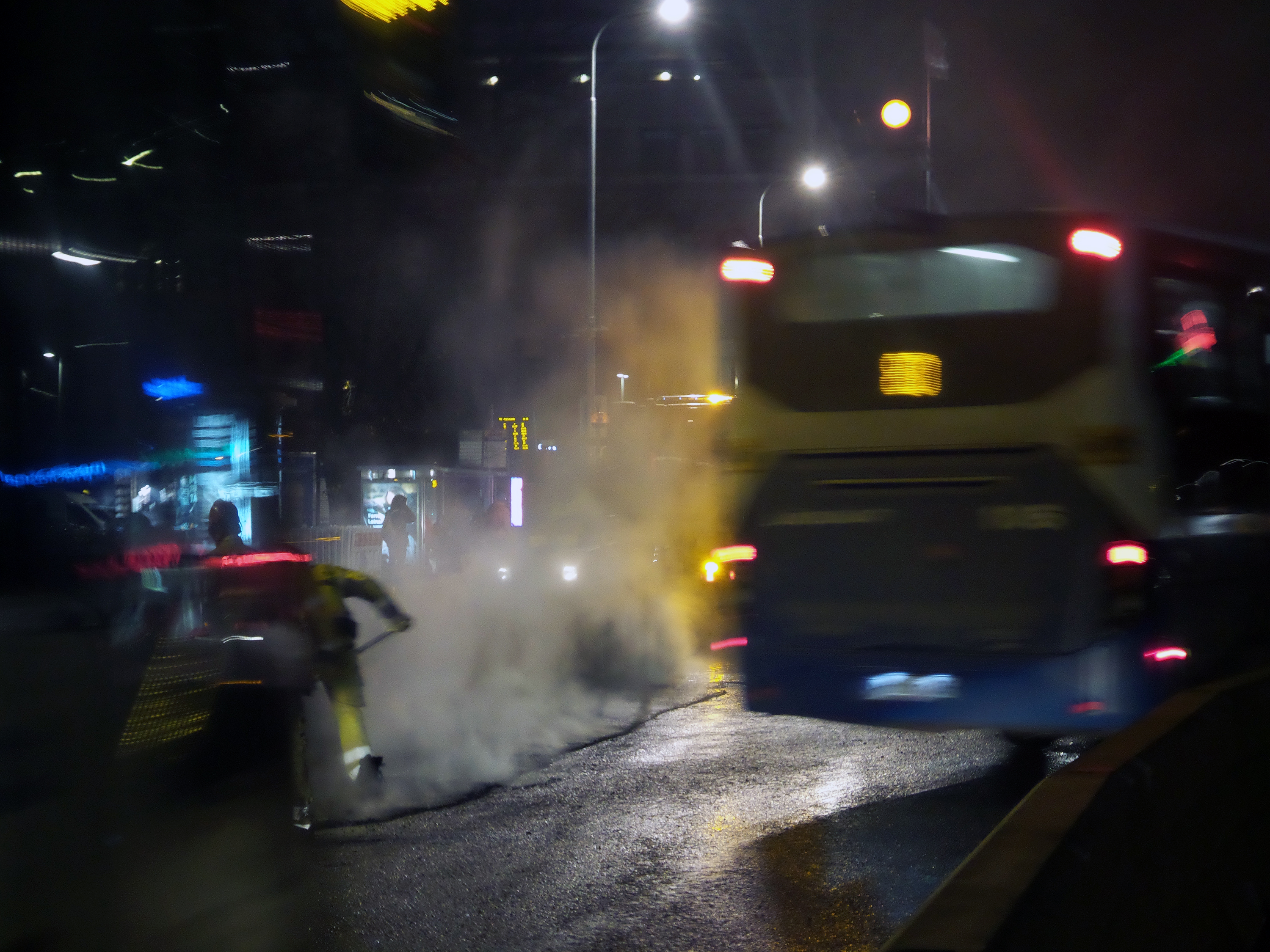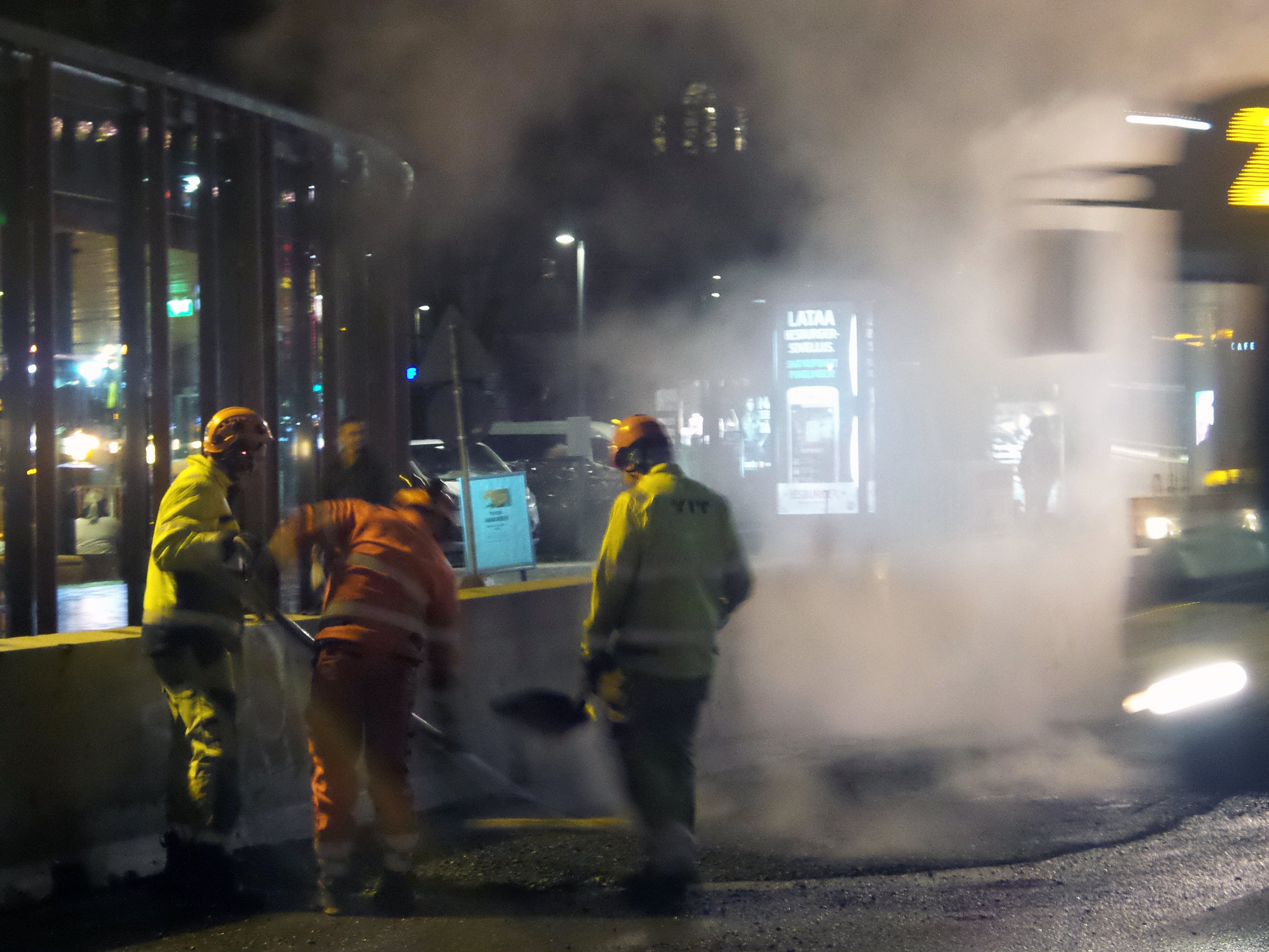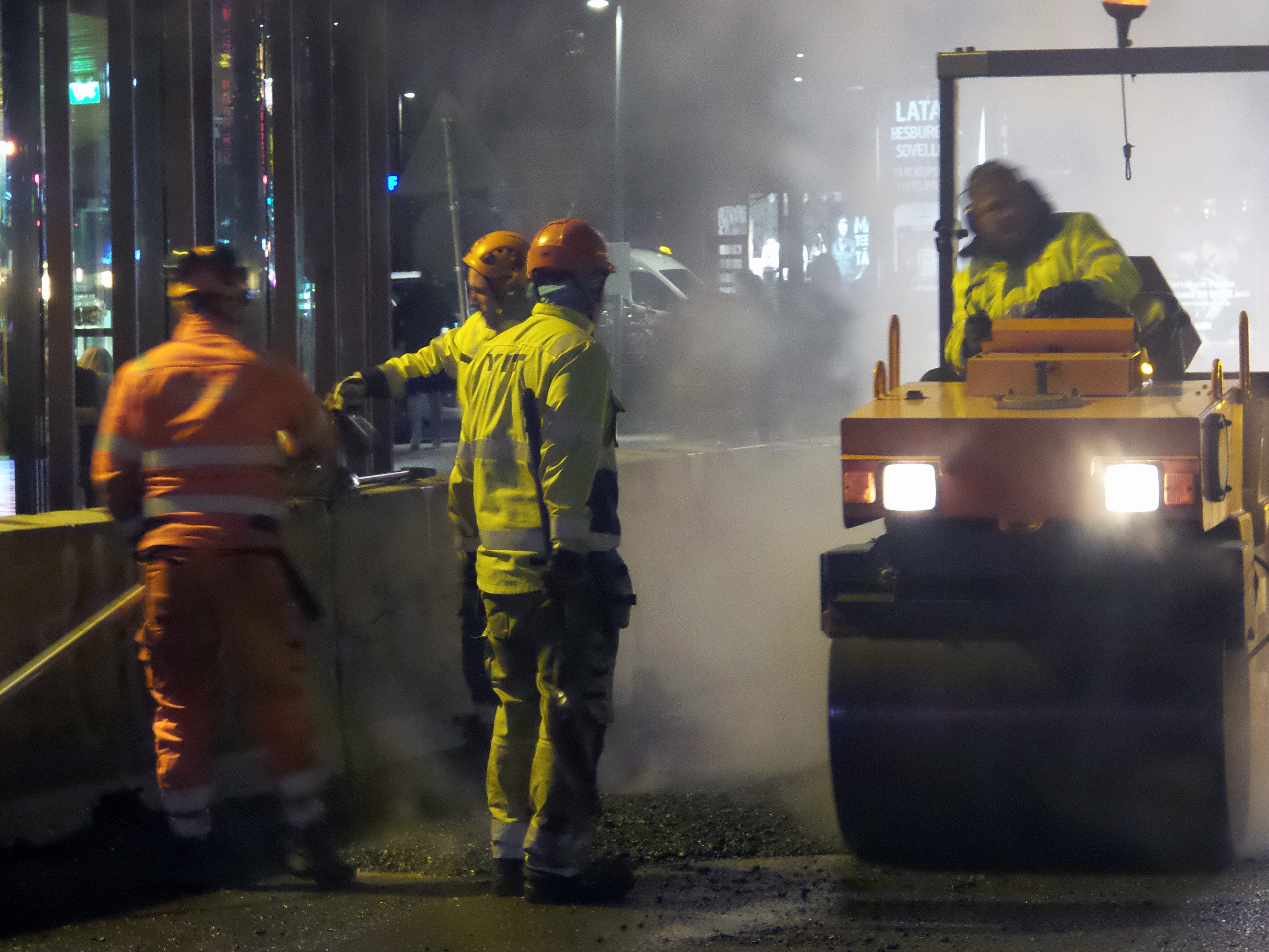 Speaking of awkward transitions or pons asinorum (two adorable words I found from the dictionary) or as we Finns say, aasinsilta = donkeys bridge, here's an aphorism for you. Life is a neverending worksite. You constantly stop doing something in order to do something else and are never completely finished. Just like Steemit. This justifies my photographs taken 21:30-20:00, October 25th, 2018 in Tampere. Asphalt workers on the Hämeensilta. (The bridge of Häme.) Steam, steam, steam and more steam!