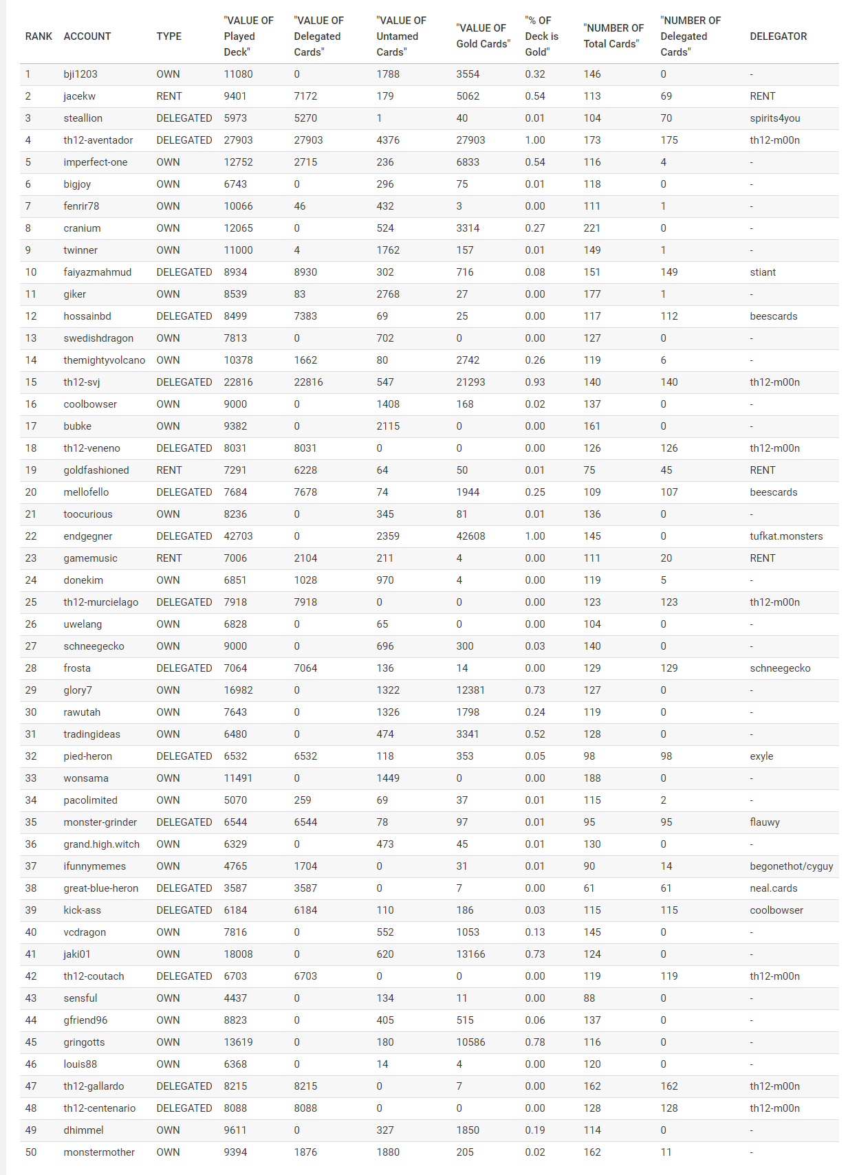 | RANK | ACCOUNT | TYPE | "VALUE OF Played Deck" | "VALUE OF Delegated Cards" | "VALUE OF Untamed Cards" | "VALUE OF Gold Cards" | "% OF Deck is Gold" | "NUMBER OF Total Cards" | "NUMBER OF Delegated Cards" | DELEGATOR |