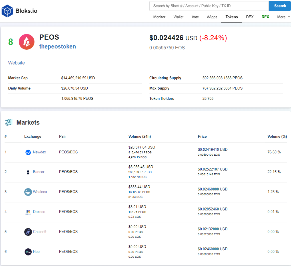 PEOS on Bloks.io Block Explorer: