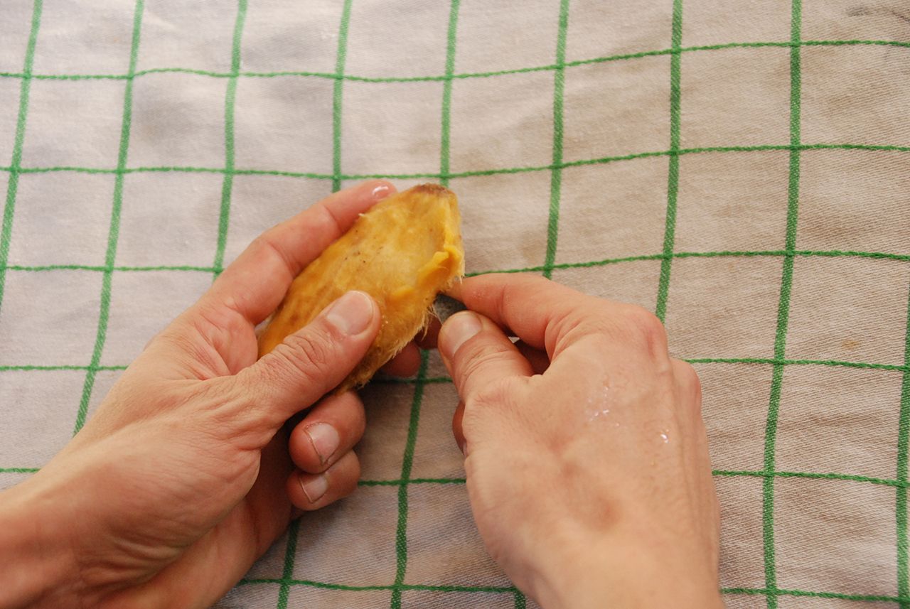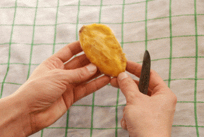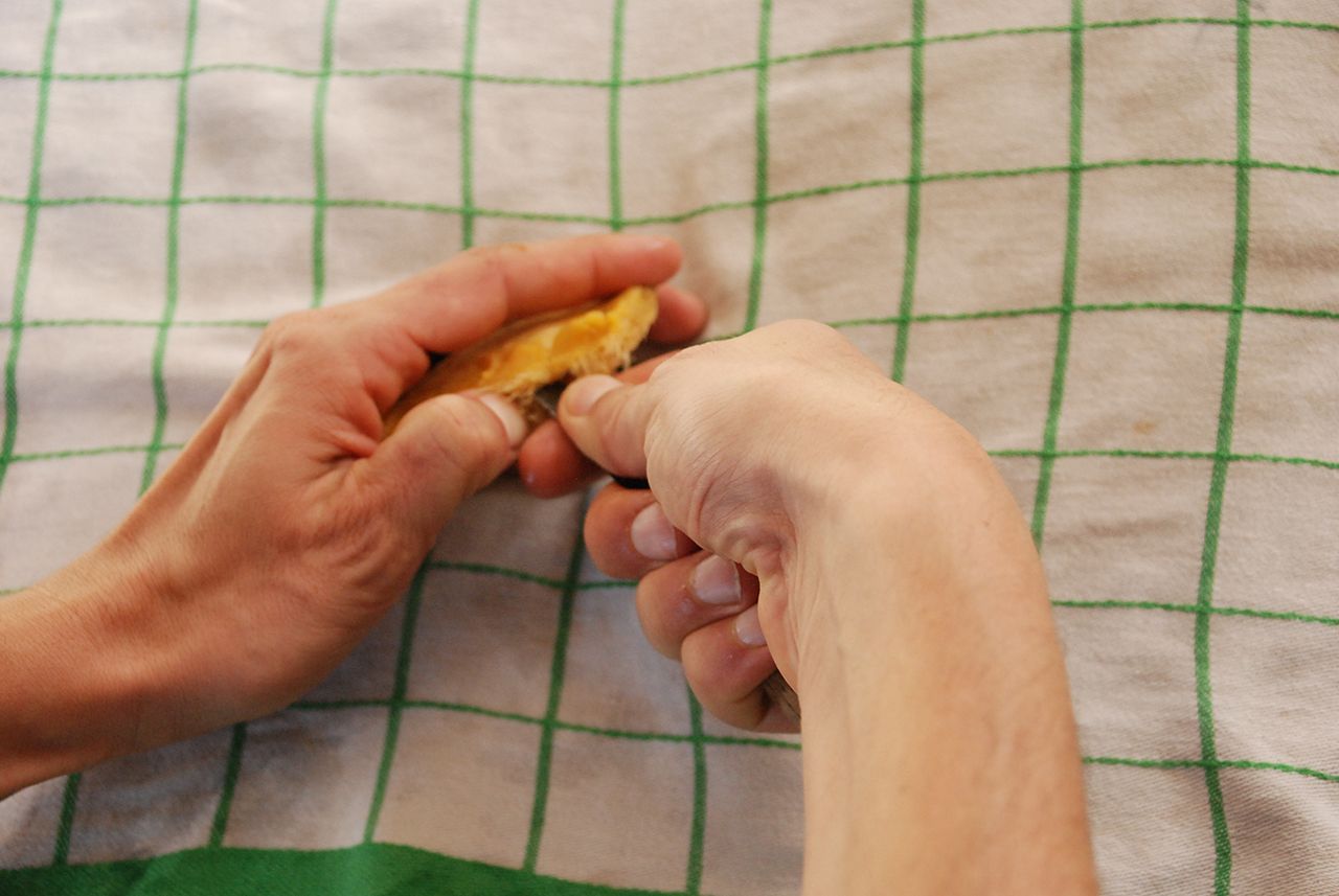Once the knife is in, give it a gentle twist to open the hard shell. Use your fingers to open the rest.
