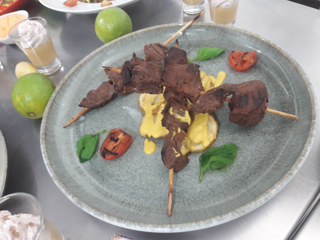 Anticucho se prepara con Corazon Vacuno, este se marina con especias se montan las brochetas y a la plancha bien caliente, como guarnicion podemos acompañar con papas o batatas hervidas y tomates cherrrys salteados.