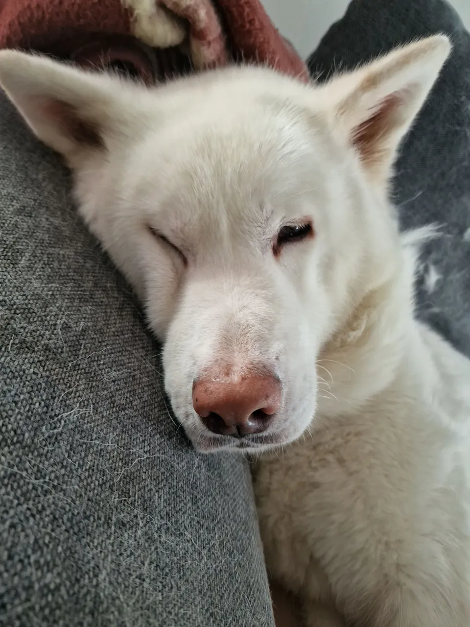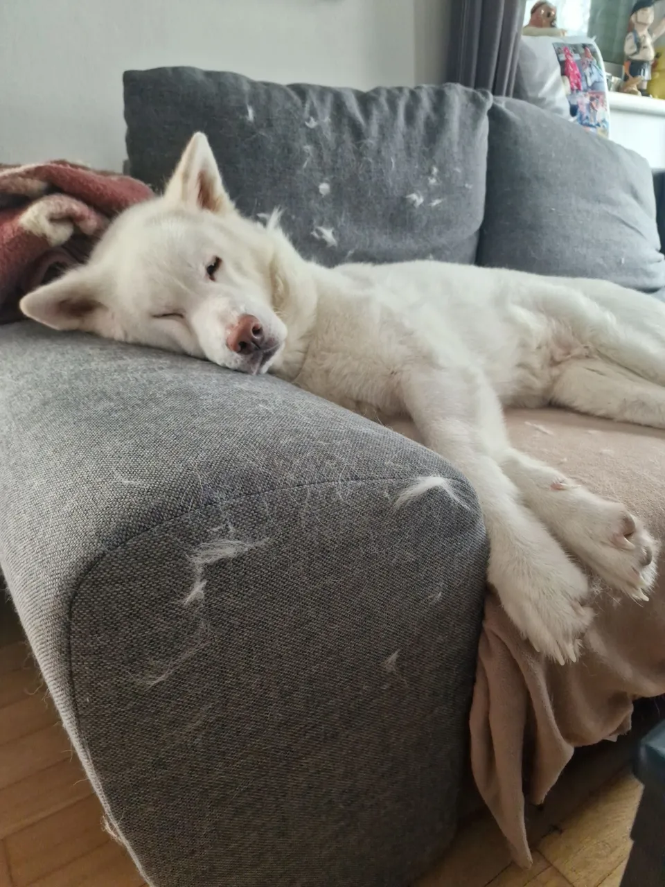 You can barely notice the fur change on the couch 😅 I honestly don’t understand people who don’t allow dogs on the couch — my Akita is a full family member, and anyone who says otherwise has never felt a dog’s love 🐾 She truly is the best dog for me (hard to train, but absolutely perfect) 🥰🐶💖 She just loves to sleep where it’s coziest💤 — and sometimes that’s the couch