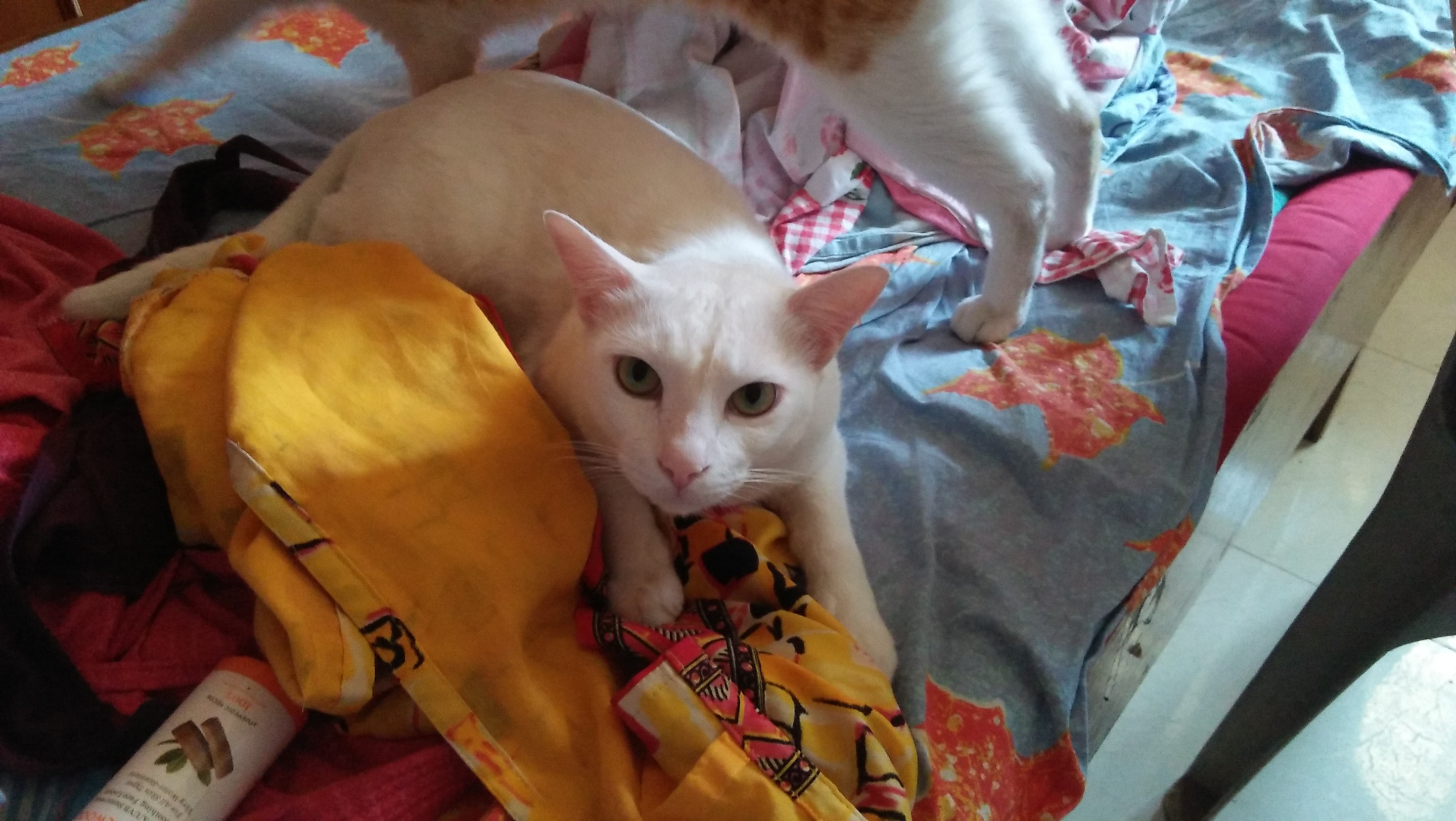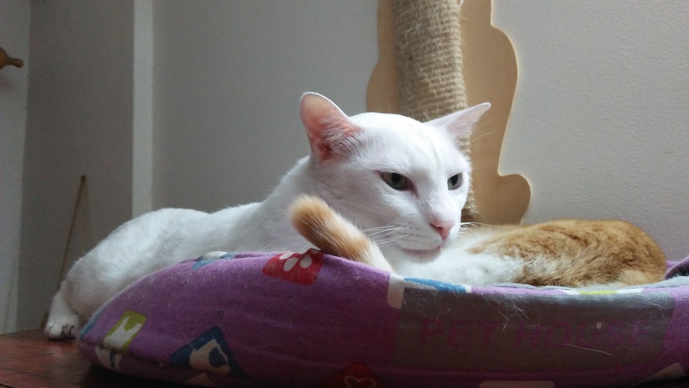 Mochu’s a rather noisy, uncloth and uncivilised, selfish cat. He would make loud noises demanding food, or simply whenever he was bored.He used to scratch me pretty badly as punishment for trying to touch him.This white cat is also super irritating, he still pushes away Garu to eat it’s plate of dry food, where Garu gives way and waits patiently till Mochu finishes eating and gets calm fulling that urge for eating.